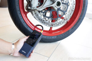 このスマートエアポンプは、バイクはもちろんのこと、自動車、自転車、ボールにも手軽に空気を入れられる充電式電動エアポンプなのだが、今回の改良で従来モデルで要望の高かったロングホースを付属するとともに、作業性を高める90度アダプタも標準装備とした。これにより、空気の充填作業がよりしやすくなっている。