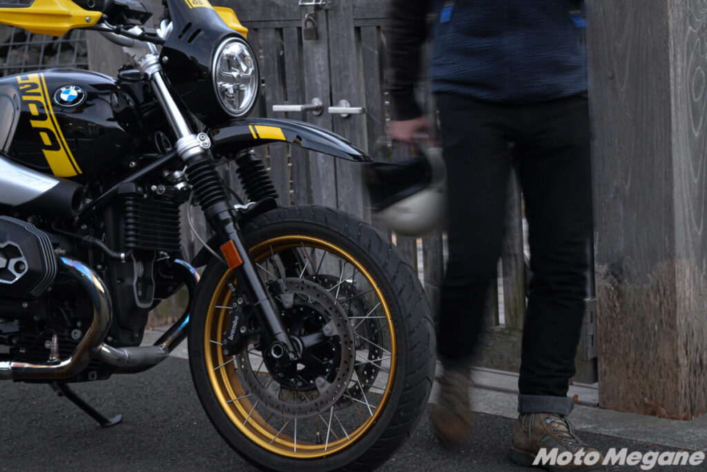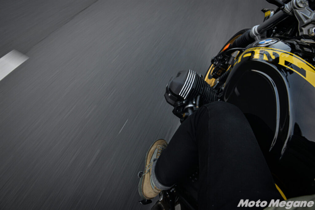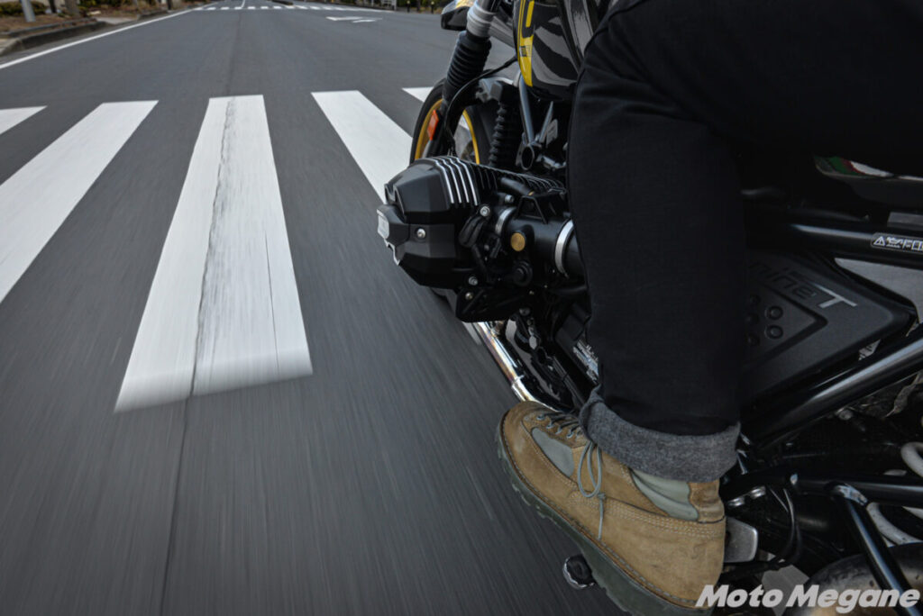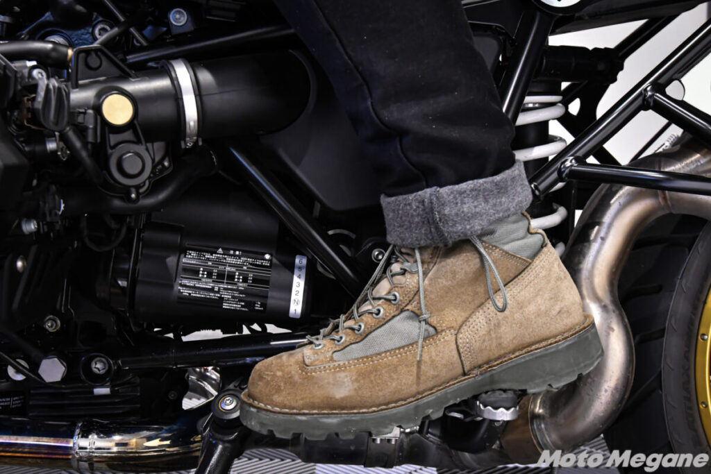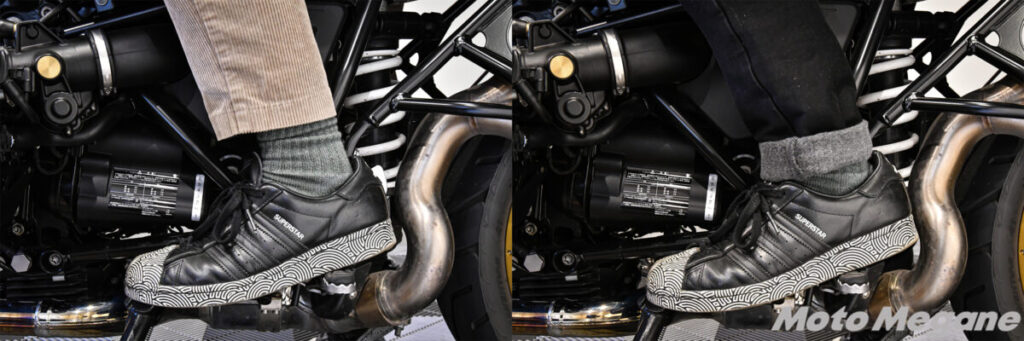 スソがどれだけずり上がるのか、わかりやすいようにスニーカーを履いてテスト。普通のパンツではステップに足を置くと足首は完全に露出! この状態で走るとむちゃくちゃ寒いですよね……。一方の「ハイスペック・ストレッチ・スリムパンツ」はというと、膝周りの生地が膝にぴったりとフィットしているため、生地が引っ張られずに立っている状態とスソの長さがほぼ変わっていません。立体裁断でもないのに!これには写真を撮っている自分でも驚きました(笑)。今回はわかりやすいようにローカットのスニーカーで撮影していますが、足首の寒さに悩んでいるライダーなら、このストレッチ性がどれだけ防寒に寄与するのかはすぐにお分かりになるでしょう。