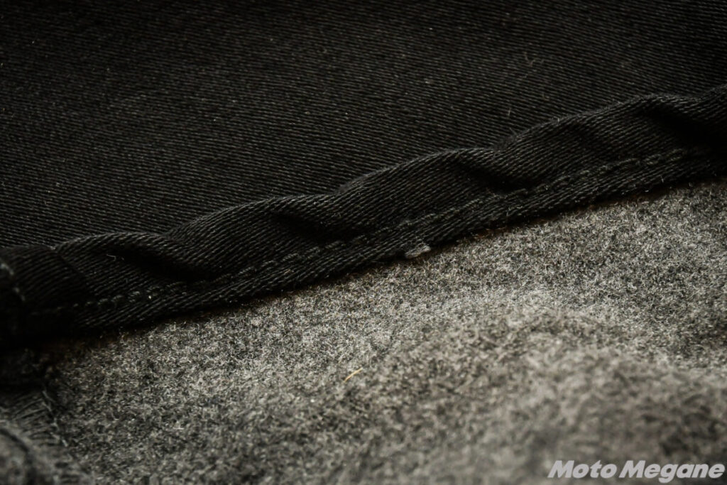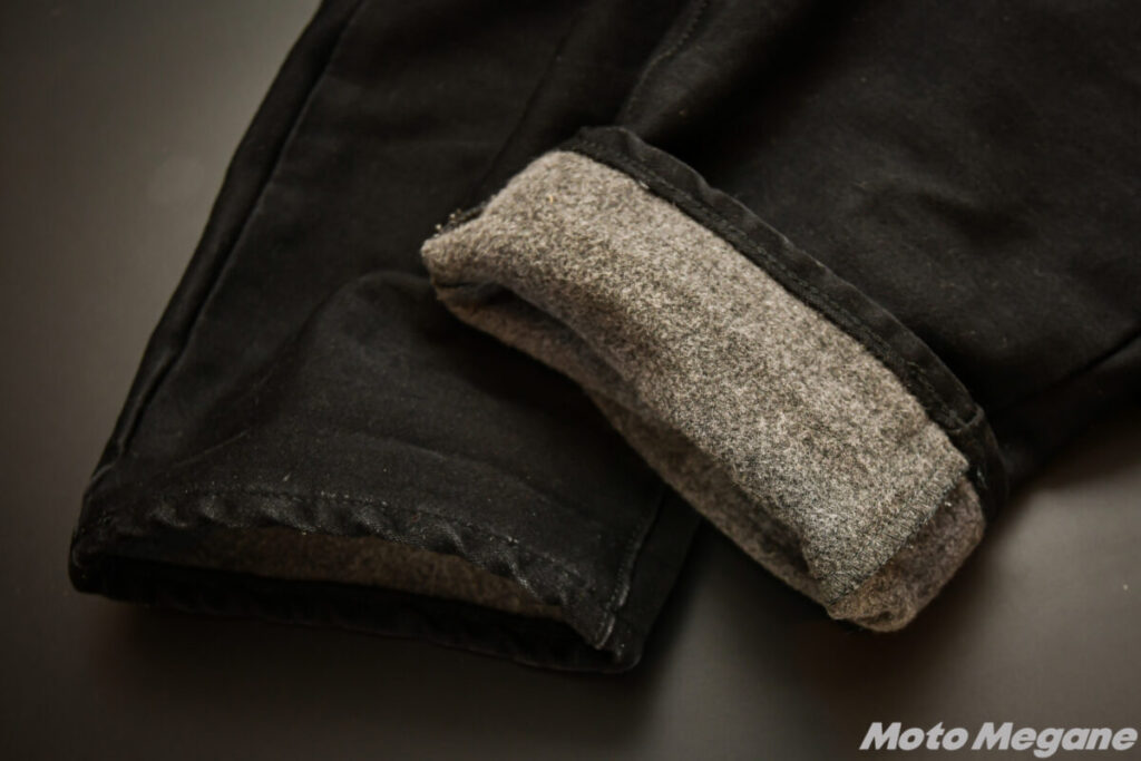 じつはこのストレッチ性能は、冬場のライディングにも非常に有効です。なぜだかお分かりでしょうか?たとえば硬いデニム生地の場合、新品の状態に近いほどウエストや腰回りが身体にフィットしづらく、デニムと身体の間に隙間ができてしまい、そこから冷気の侵入を許してしまいます。防寒では、ある程度の空気の層を作ることも必要ですが、衣類と身体の密着度も重要なポイントなんです。