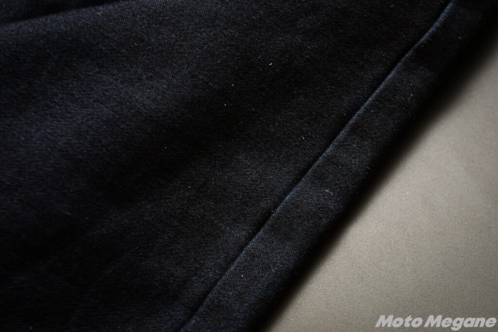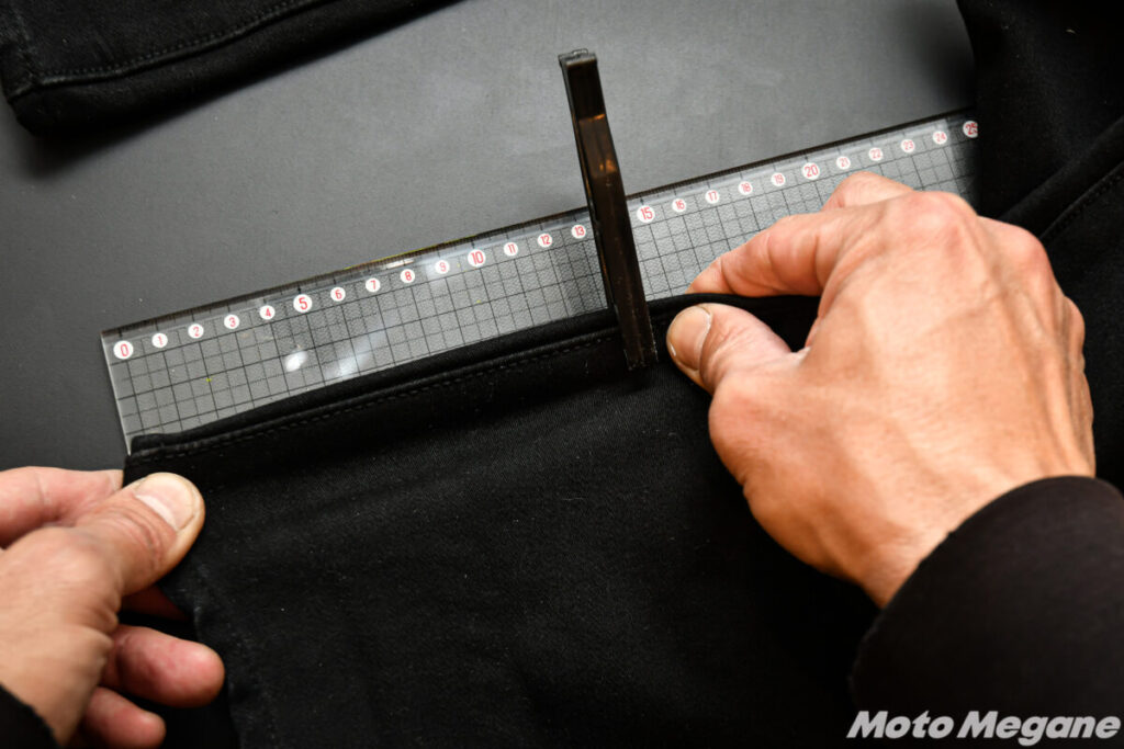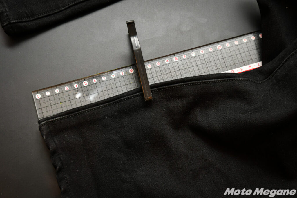 そこから生地を縦方向にグイッと引っ張ると、なんと3cm以上も伸びたのです。通常のデニム生地ではあり得ない伸び! 生地にはレーヨンを織り込んであるので、こうした伸縮性が実現しているんですね。このようなストレッチ性ですから、バイクに跨ったり、しゃがんでみたりしても、通常のデニム生地にありがちなツッパリ感は皆無なのです。