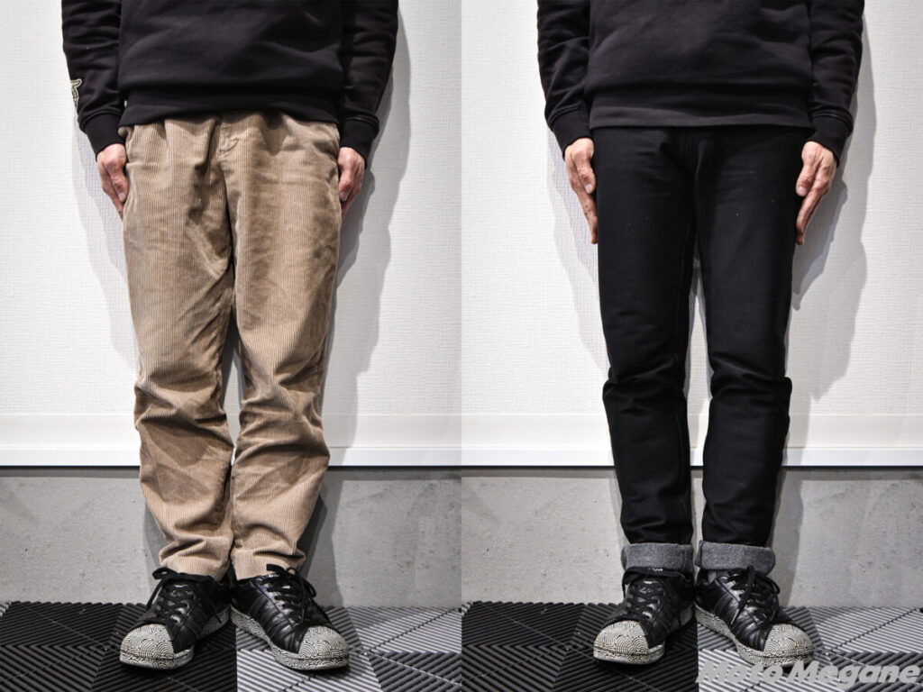 左はライディング用ではないコーデュロイ生地の普通のパンツで、右は「ハイスペック・ストレッチ・スリムパンツ」。比較用に「ハイスペック・ストレッチ・スリムパンツ」のスソ長さは普通のパンツと同じになるようにロールアップしました。