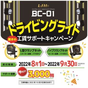 1つの灯体からホワイト・イエロー2色のランプカラーを切り替え照射できる優れものとなっており、手元のスイッチ操作で切り替えが可能。工賃のサポート金額は3000円となっており、期間中に購入・申請 (申請受付は10月31日分まで)を行うことで、銀行振込 または電子マネー(PayPay)によってキャッシュバックを受けられる。