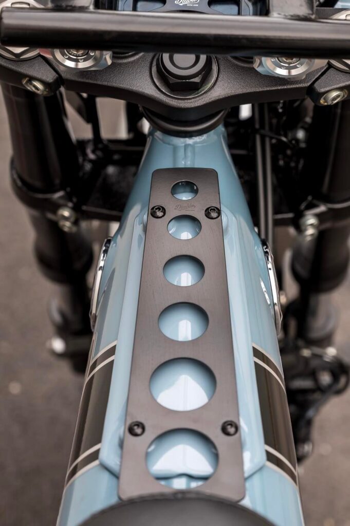写真下はスポークホイールへの換装なども含めて車体すべてに手を入れたデモバイクです。オールブラックでまとめたワイルドな車両には、どこかMAD MAX的な雰囲気も漂っています。