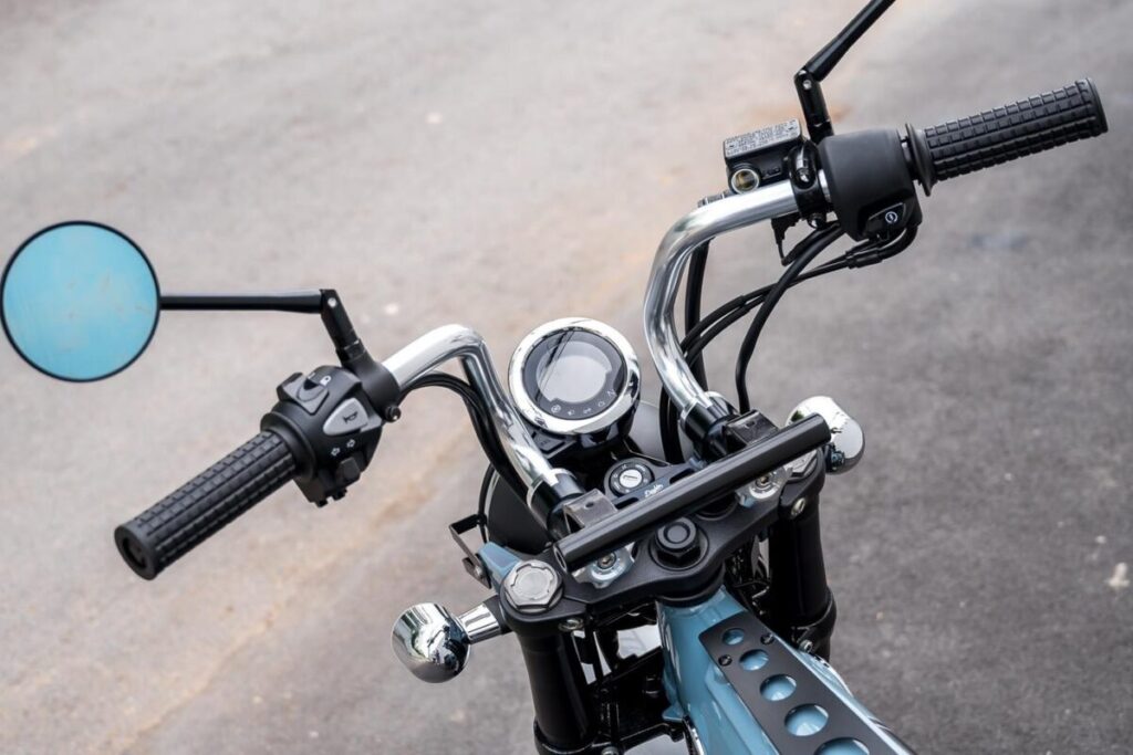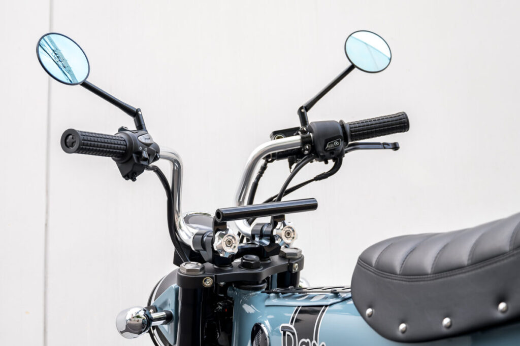純正ではパイプハンドルを採用するDAX125。しかし、かつてのオリジナルのモンキーシリーズと同様にDAXシリーズでは折りたたみ式のハンドルを採用していました。このハンドルキットは、左右セパレートの折りたたみ式ハンドルに変更するキットです。クランプ部はもちろん、手回し可能なアルミ削りだしのアジャスターのほか、各種マウントステーを装着可能なユーティリティバーも備えた親切設計です。独特の絞りとシェイプもクール。価格:4万5100円(税込)