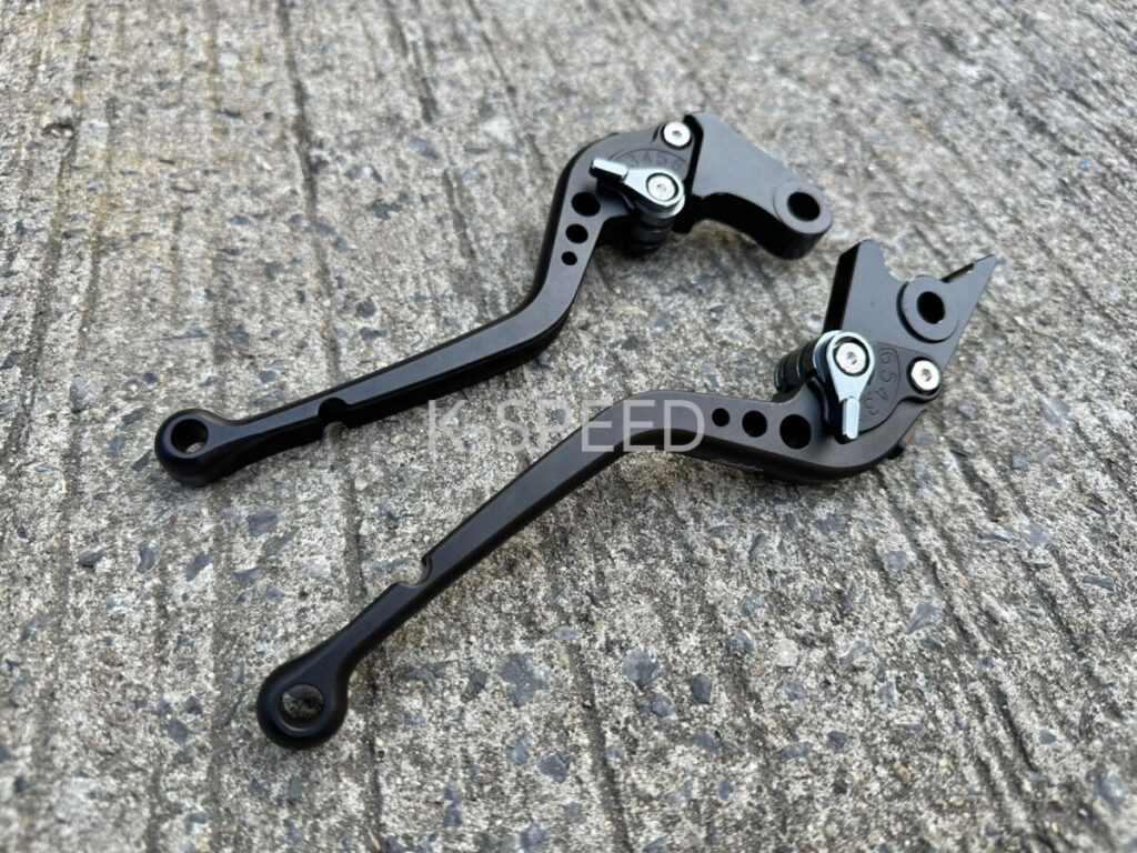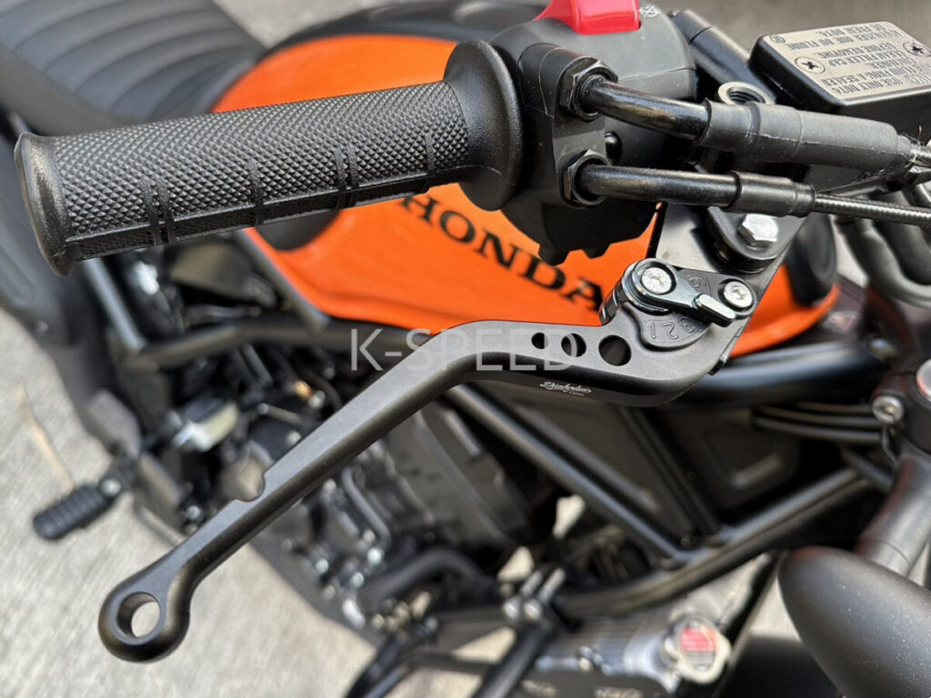 シャープな造形のアルミ製レバーは、本体をブラックアルマイト加工としたシックなデザイン。純正レバー同様に、6段階のアジャスターを装備しているので、手の大きさや好みのレバータッチに合わせて最適なレバー位置に調整可能です。また、先端付近には切れ込みを設けており、万が一車体を倒してもレバーが完全に折れづらい親切な設計です。価格:1万4600円(税込)
