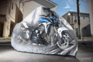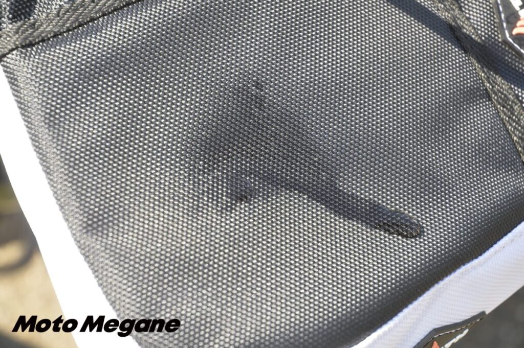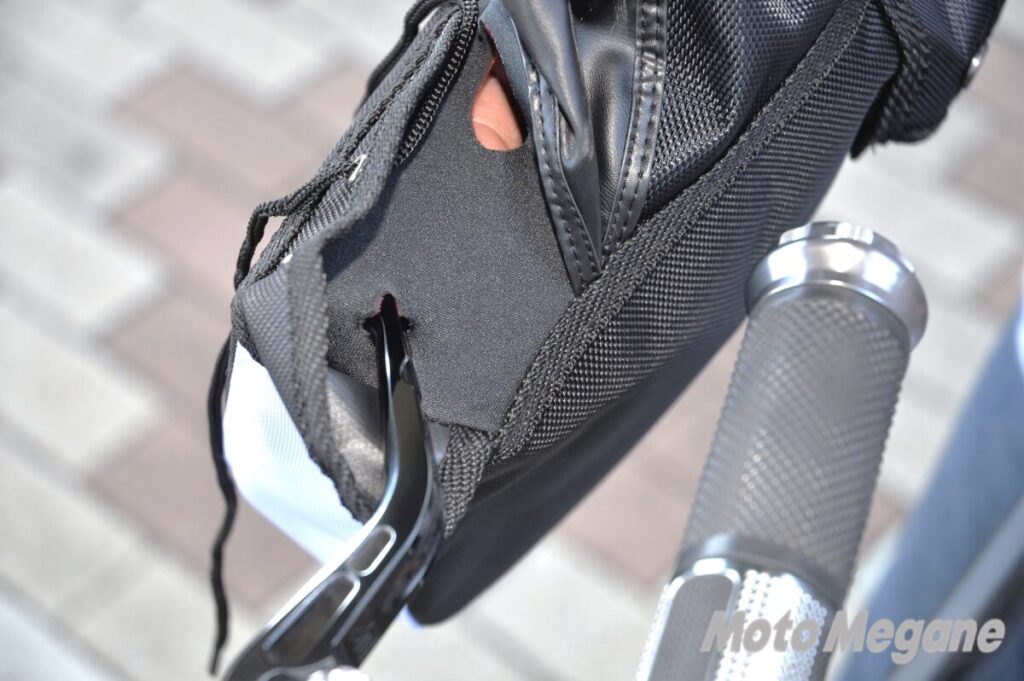 取り付けはハンドルとレバーを本体のネオプレーン部分の穴に通し、ミラーステーに紐で固定するだけ。ネオプレーン素材が雨風の内部への侵入をしっかり防ぐ構造だ。着脱が簡単なので複数台で使いまわしたり、取り外して気軽に洗濯(手洗い)もできる。