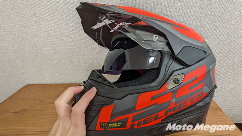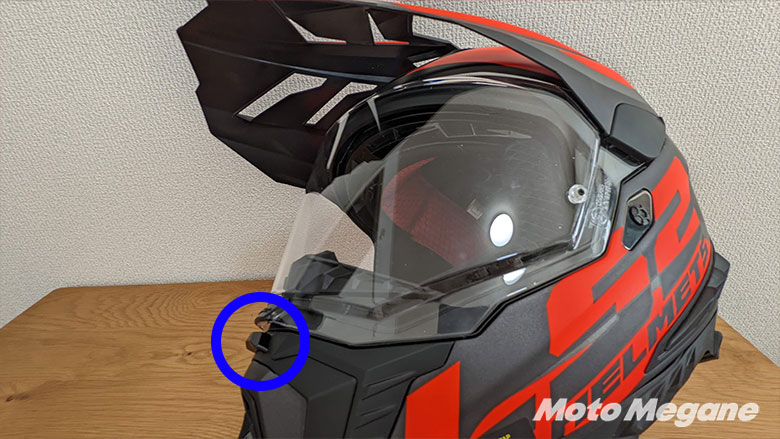 シールドはカチッとしまるタイプで、開けるときは青丸のスイッチを下に下ろして開くタイプ。