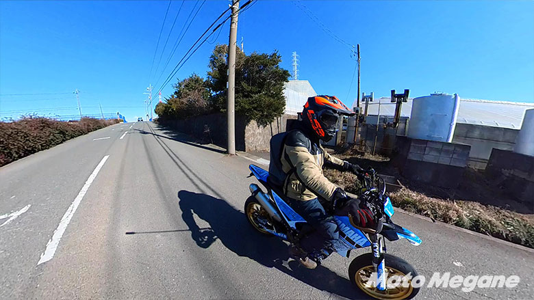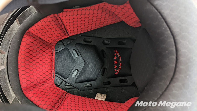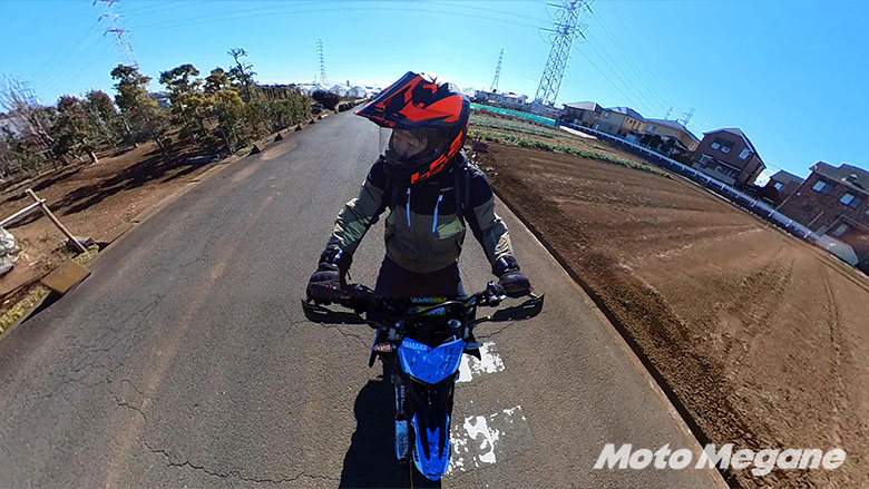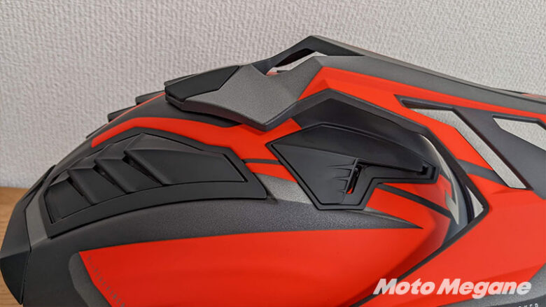 未舗装路の走行は一般道に比べて積極的な操舵を要求されます。当然汗をかきやすくなるのでオフロードに重きを置いたヘルメットなのかもしれません。