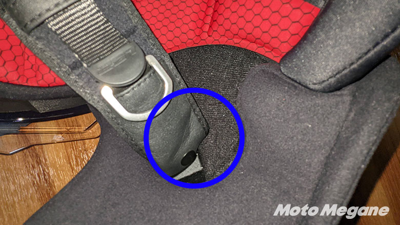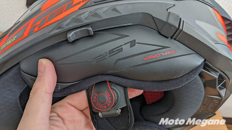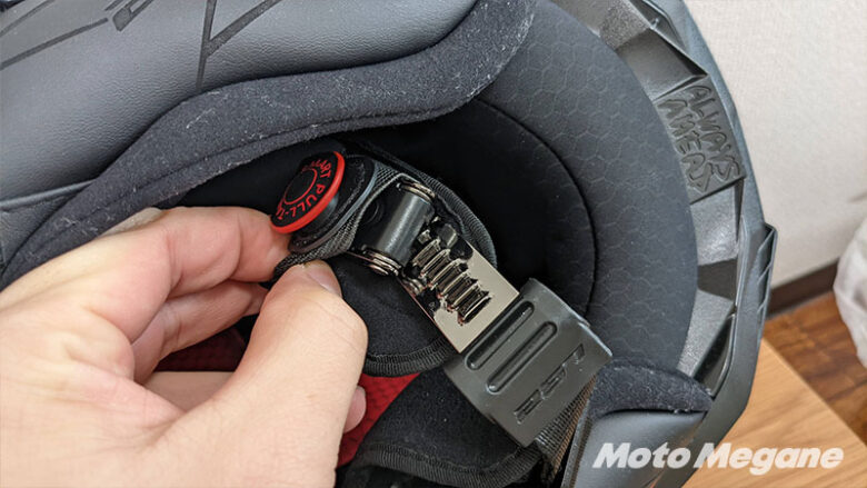 顎紐はDリングではなく、ベルト式!折り返してマグネットで留めるという珍しい造りです。