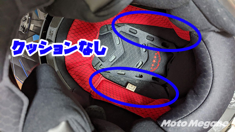 他に所有しているヘルメットの場合はクッションがある箇所なのですが、Explorer Fにはありません。理由としてはベンチレーション効果を重視しているからでしょう。