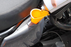 実際、サイドスタンド支持でオイル缶2本分入れてみたところ、全然足りておらず結局3本目の半分ぐらいまで注ぎ足しました。