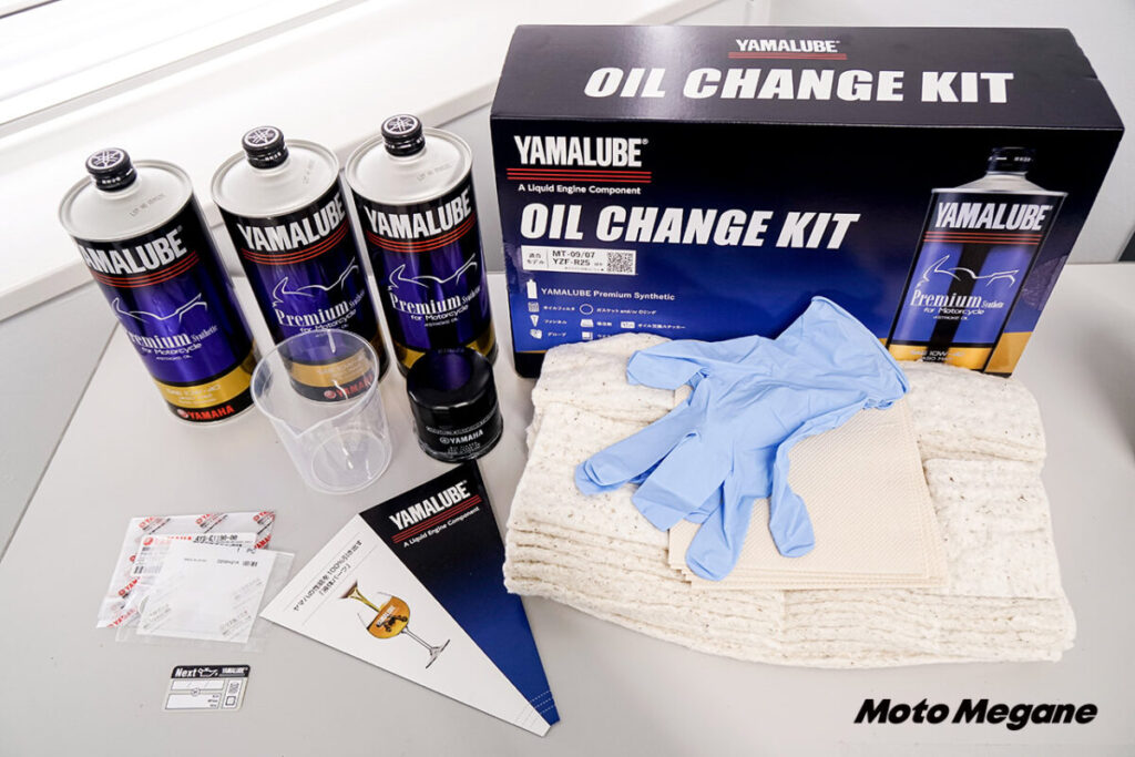 セット内容:YAMALUBEプレミアムシンセティック1L(3本)/オイルフィルターカートリッジ/オイルドレンガスケット/漏斗/計量カップ(300ml)/オイル交換時期リマインドステッカー/手袋(1双)/紙ウエス(5枚)/吸油材(4.5L用)/結束バンド/取扱説明書