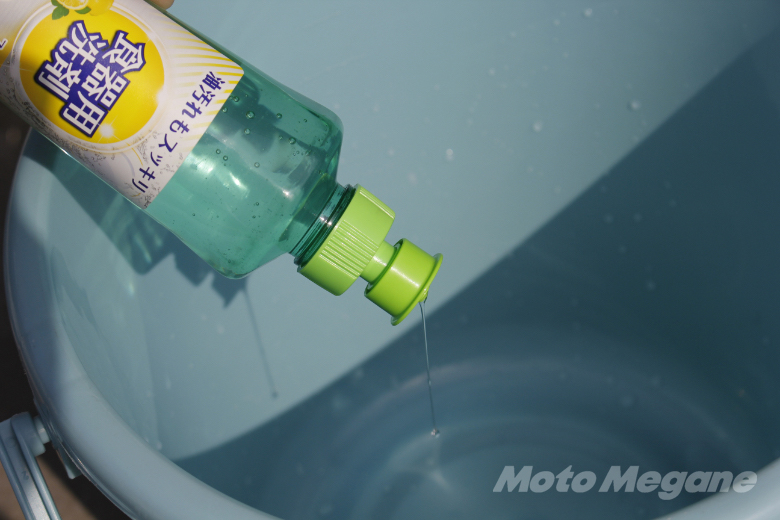 今回はシャンプーとして中性洗剤を使用します。ドロドロのオフ車とか、油ギトギトの旧車はアルカリ洗剤が良い気がしますが、普通の汚れであれば中性洗剤で事足ります。