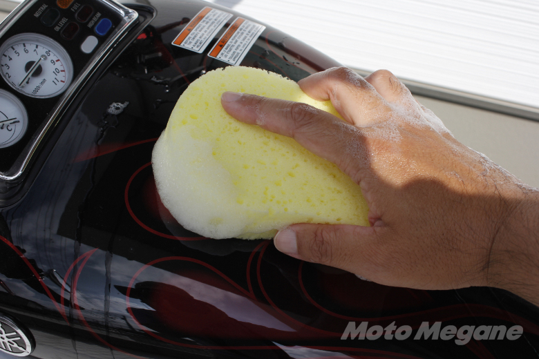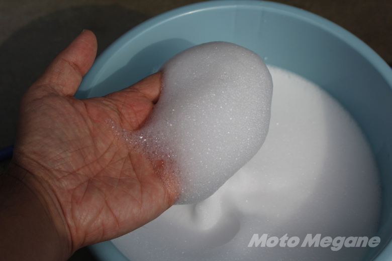 塗装のクリア層は簡単に傷つくので、たっぷりの泡で撫でるように洗います。