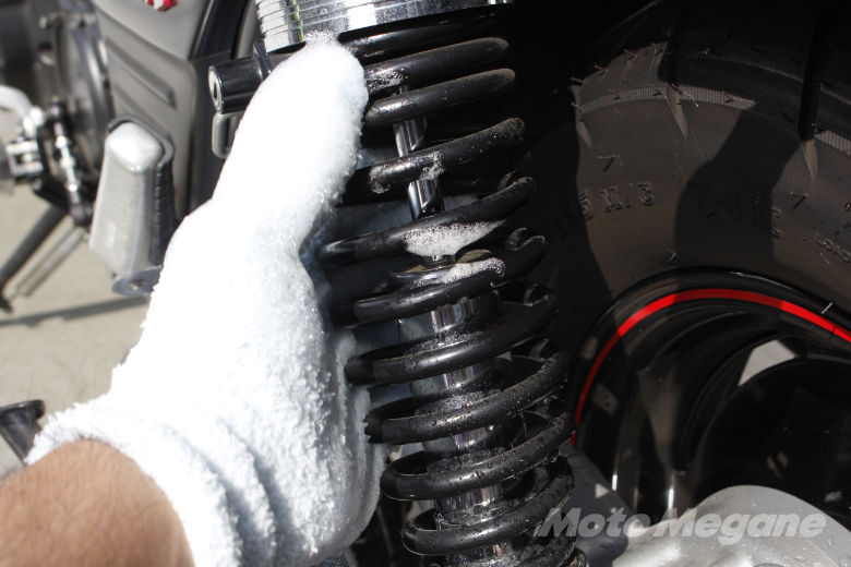リアショックのスプリングの隙間も握るようにして洗えるのです!
