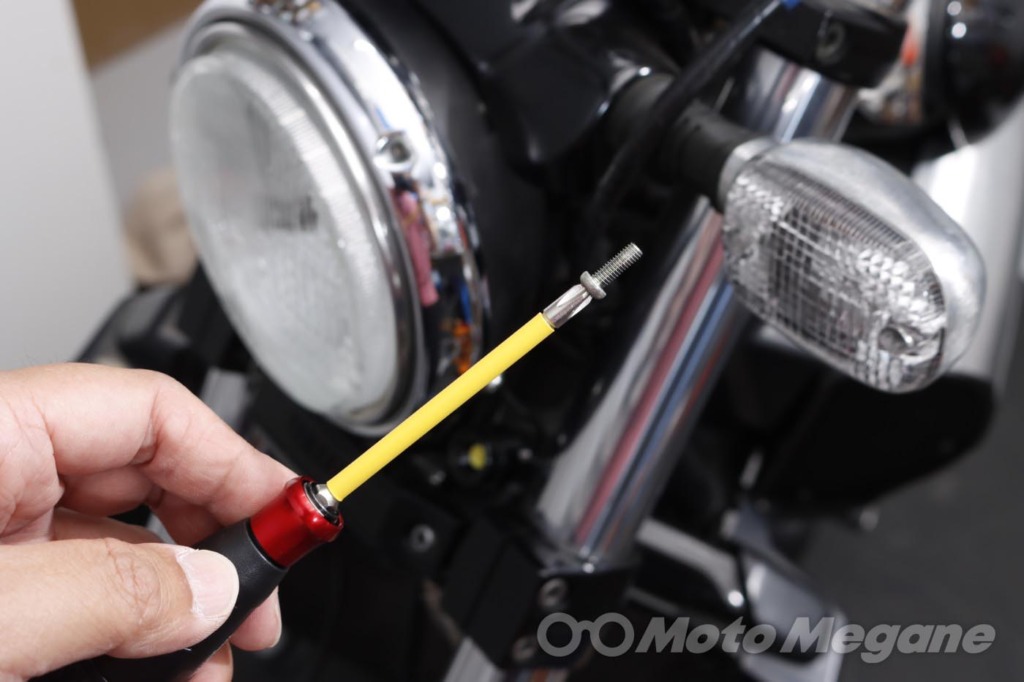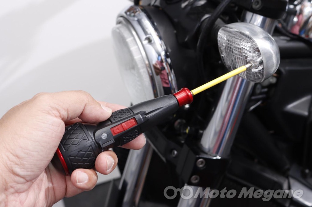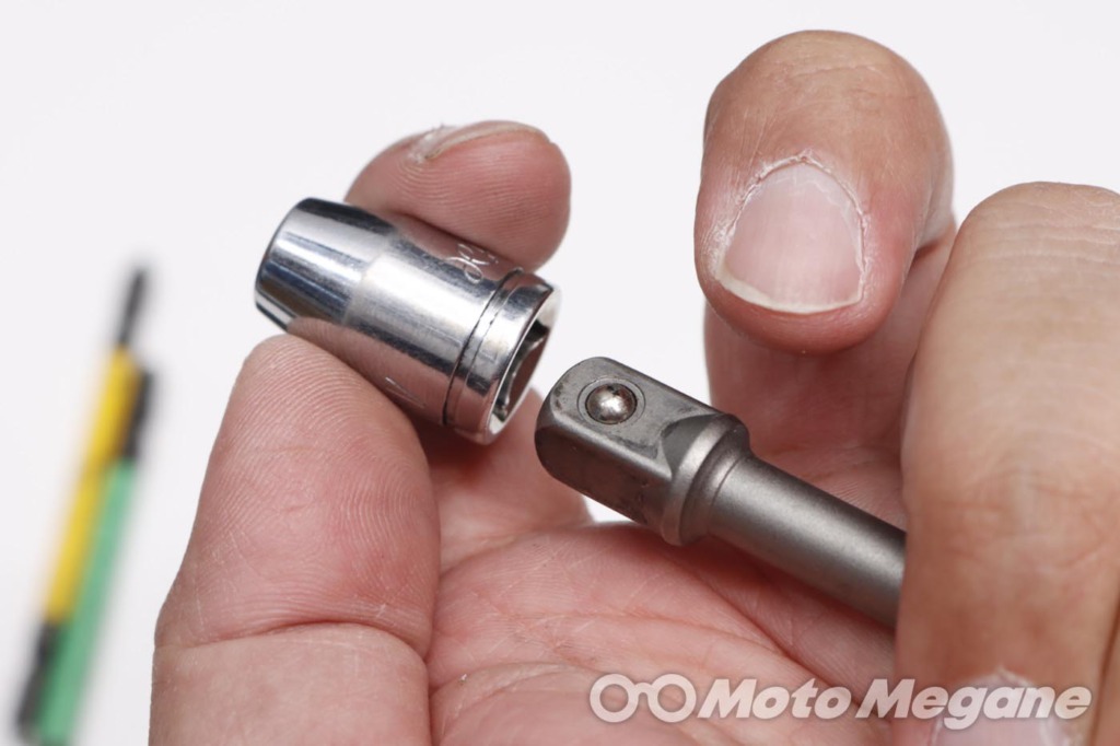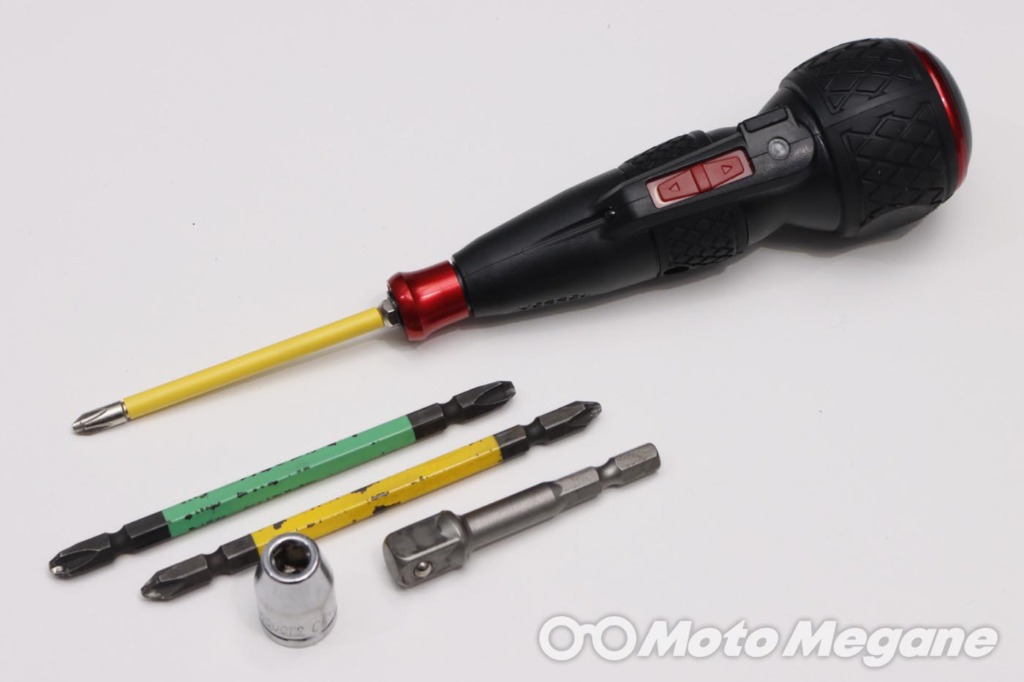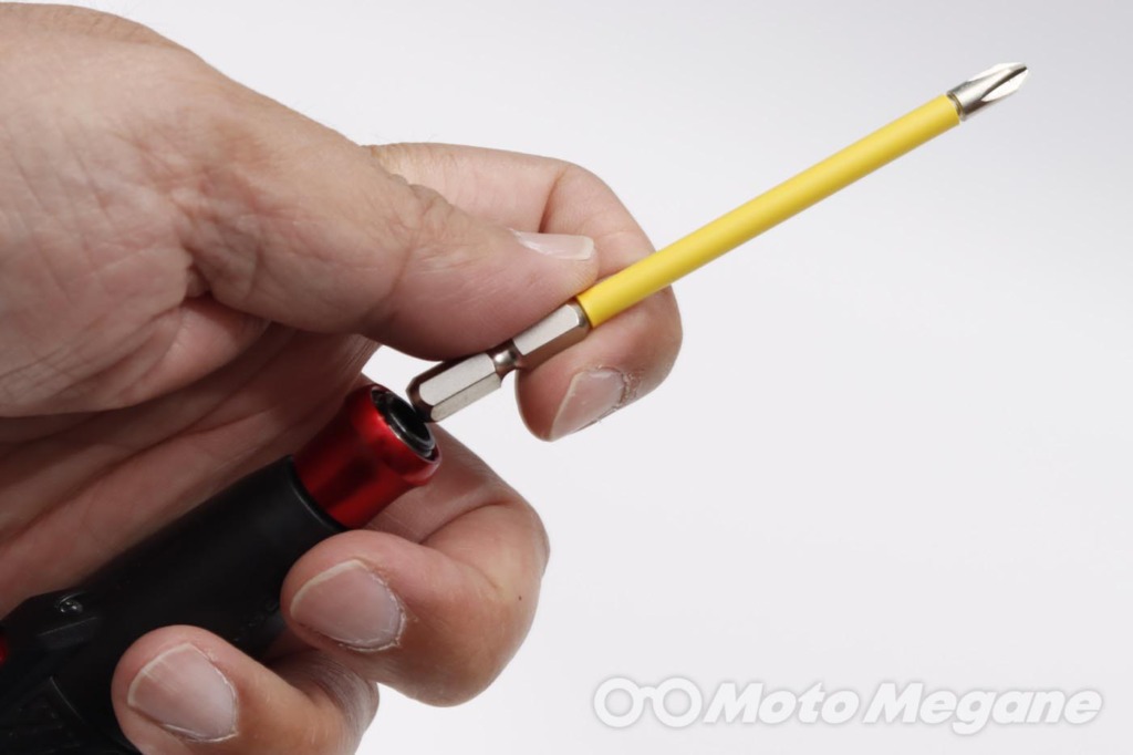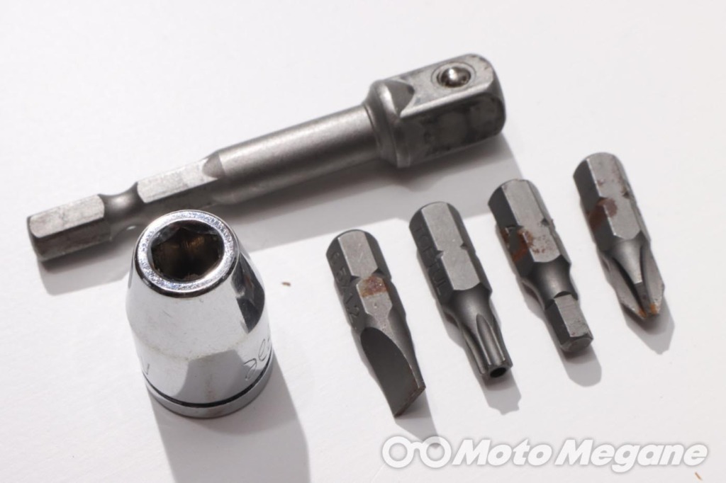 バイクの車体にはプラス、マイナス、様々なサイズの六角、ヘックス、トルクスなどいろいろなボルトが使われているが、それらに対して電ドラボールを使うことが可能だ。