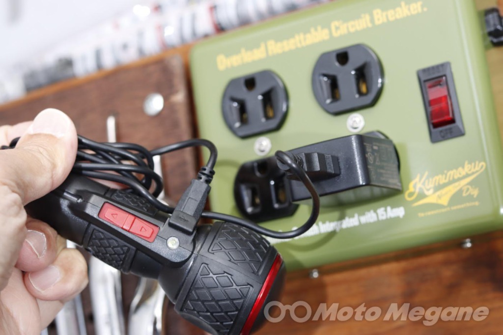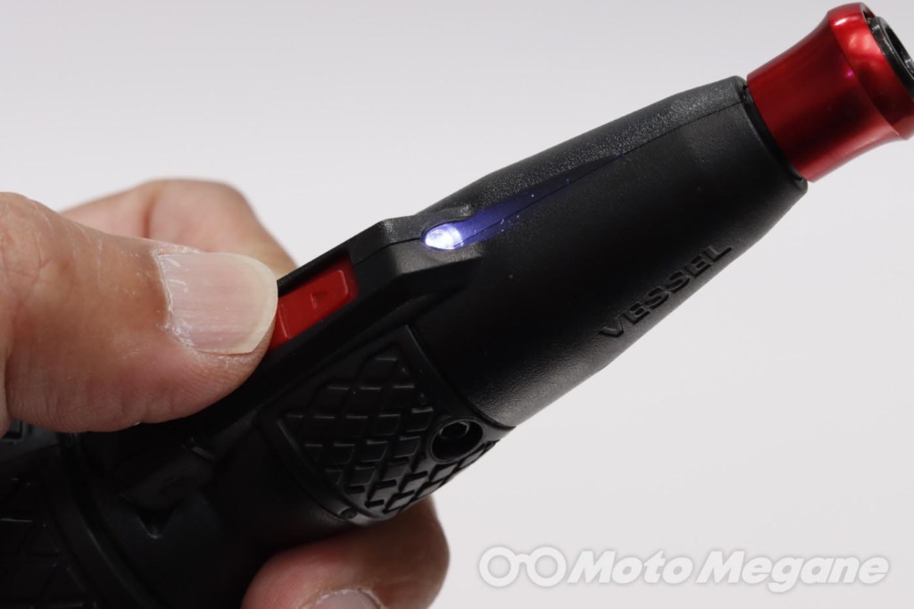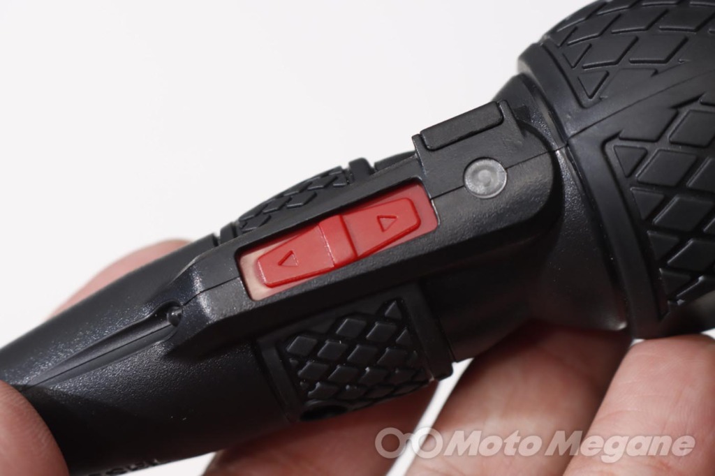 スイッチが奥まっているので意図せず触れて誤動作することが無い。モーターが動くと同時にLEDライトが点灯する。