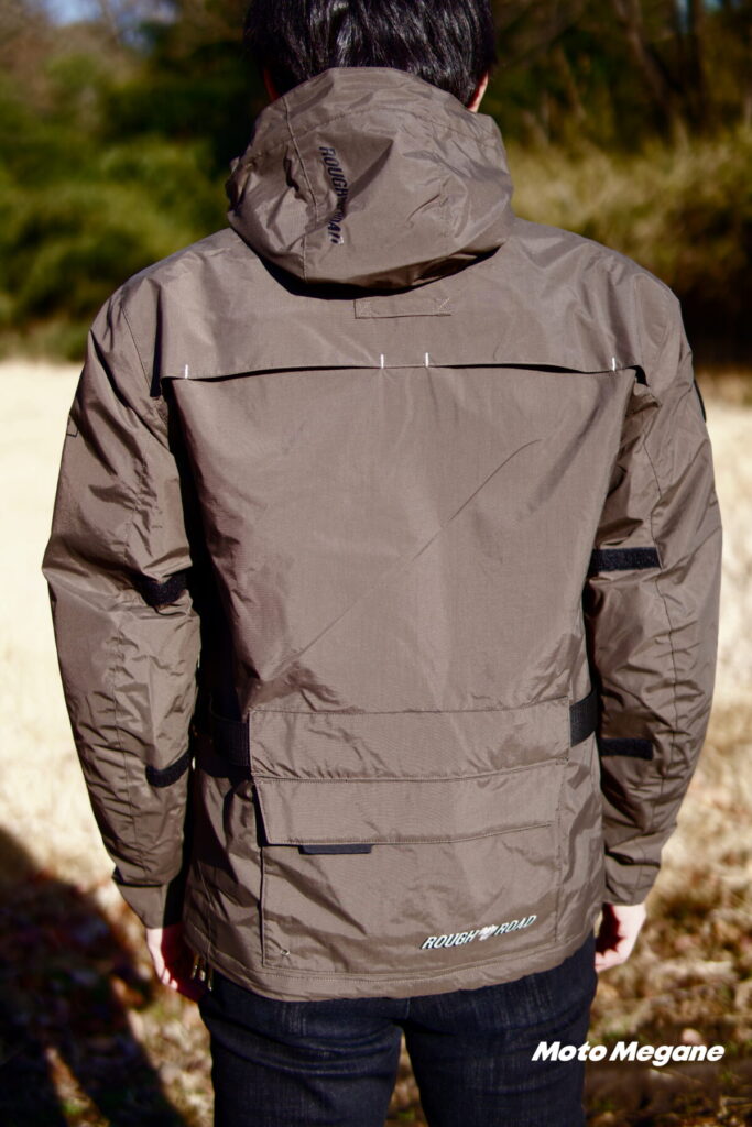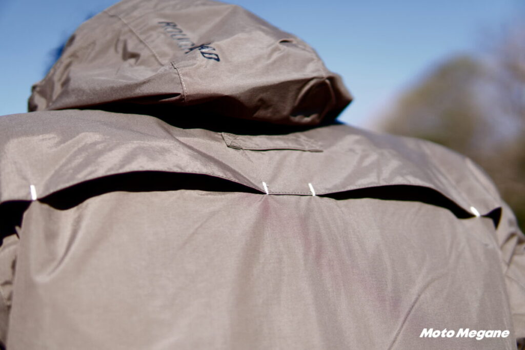 バイク用に作られていないため、袖やフードはバタつくし、バイクでの風速は日常ではありえない速さであるため、縫い目がほつれないしっかりとした縫製が必要だ。防水性も高いレベルでないと染みてきてしまう……。