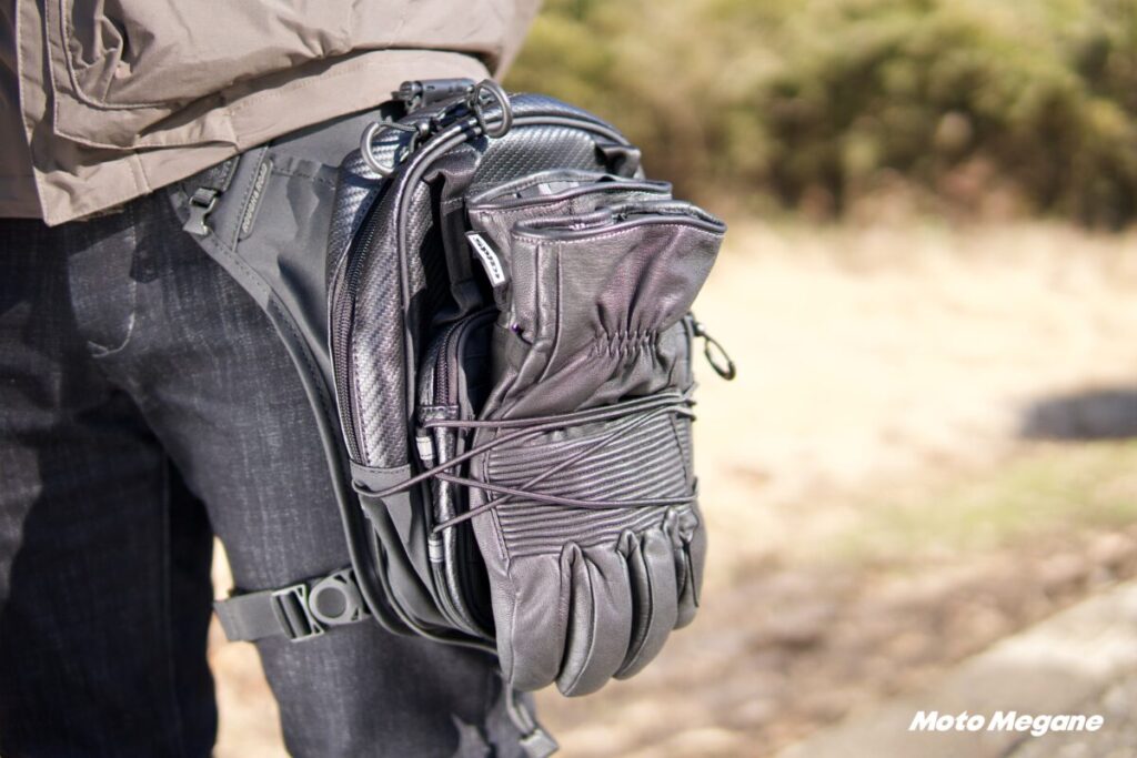 テンションコードはバッグの厚みを調整でき、内容物が少ないときにはバッグを圧縮してスリムにできる。またこのテンションコードに外したグローブを固定でき、休憩時にバイクから離れる時も安心!