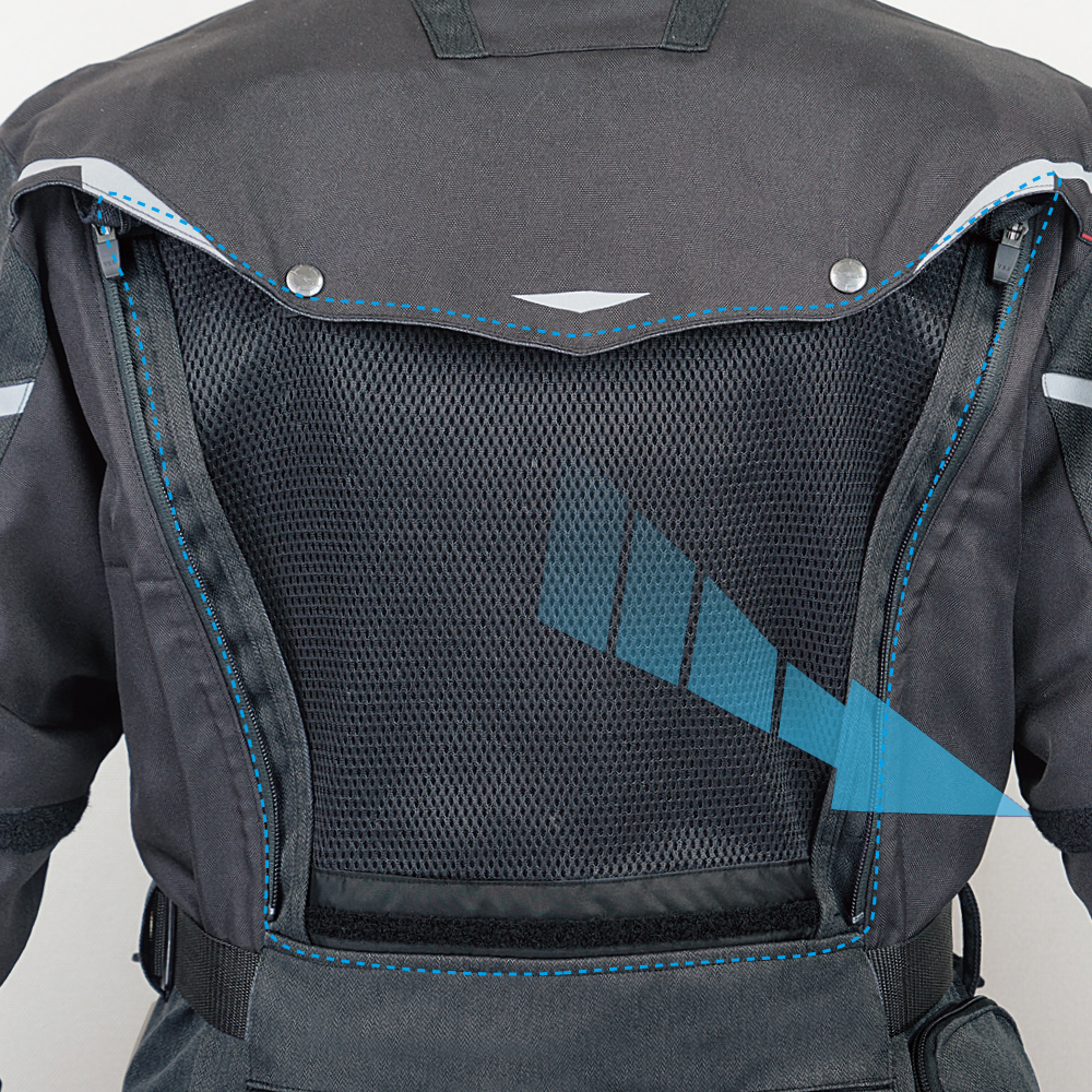 二つのファスナーで大きく開くバックベンチレーションパネルが内部のムレを効果的に排出。