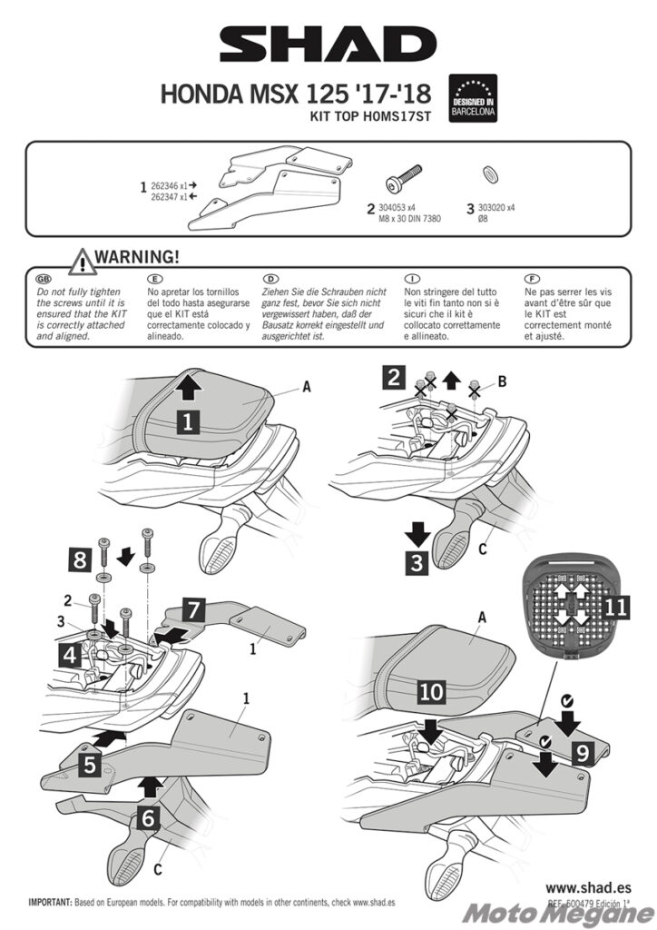 SHADの樹脂製トップケースとなるSHシリーズには、汎用の車体装着用ベースプレートと取り付け用金具が同梱されているため、愛車のGROMにリアキャリアをすでに装着している場合、これらの付属品を使用することでフィッティングできる。加えて、SHADは車種専用のフィッティングキットを展開。GROMの場合、日本では2016年6月から2021年2月まで販売された2型に適合するフィッティングキット(品番16316829)が用意されている。
