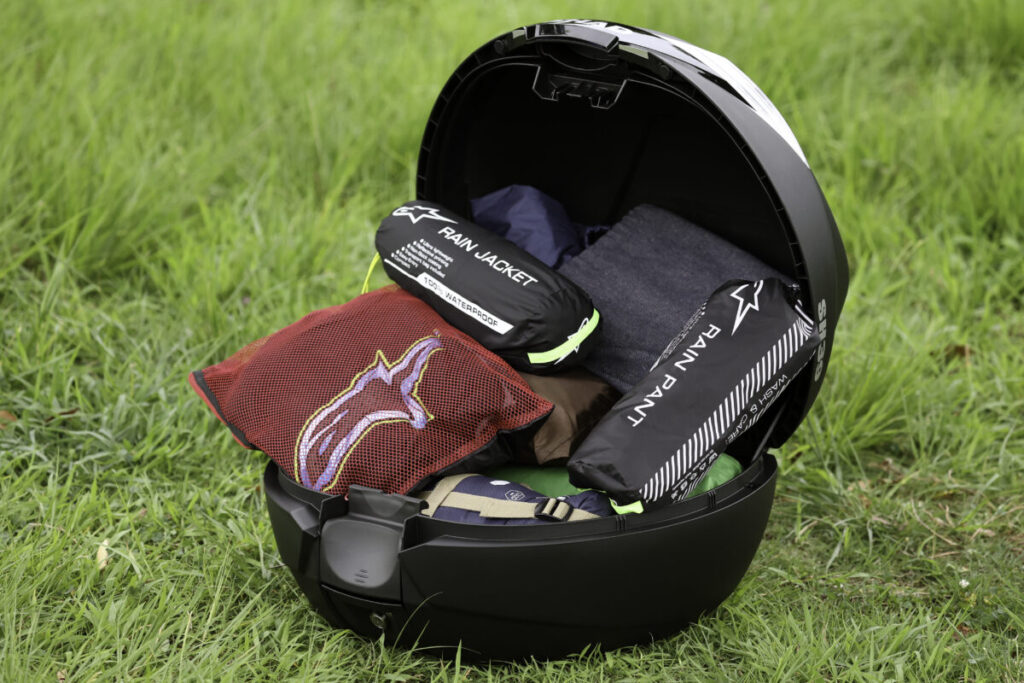 このうち、スリムなPCXとのマッチングがよいのは、SH40あたりまでのサイズとなるだろう。ちなみに、最もコンパクトなSH26でも、フルフェイスヘルメットの収納が可能。SH39なら、1泊のライトなキャンプツーリングを想定したテントとタープ、夏用シュラフとマット、焚き火台とメスティンなどのクッカー類、1泊分の着替え、レインウエアなどがすべて収納できる。シート下トランクにタープポールなどの長モノを振り分けて収めれば、PCXを本格的なキャンプツーリングマシンとしても使えそうだ!