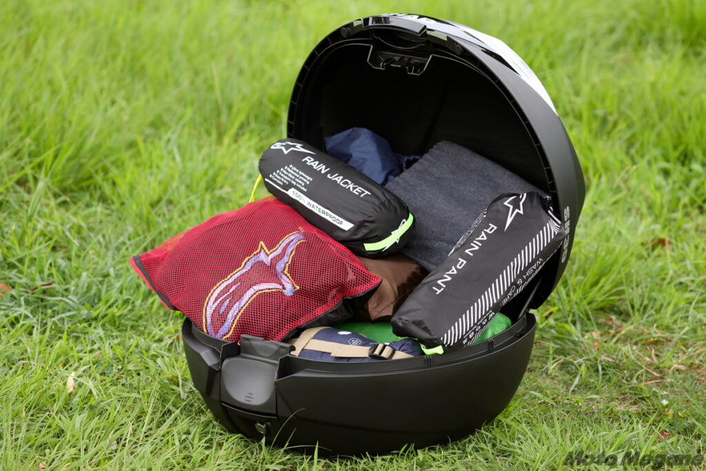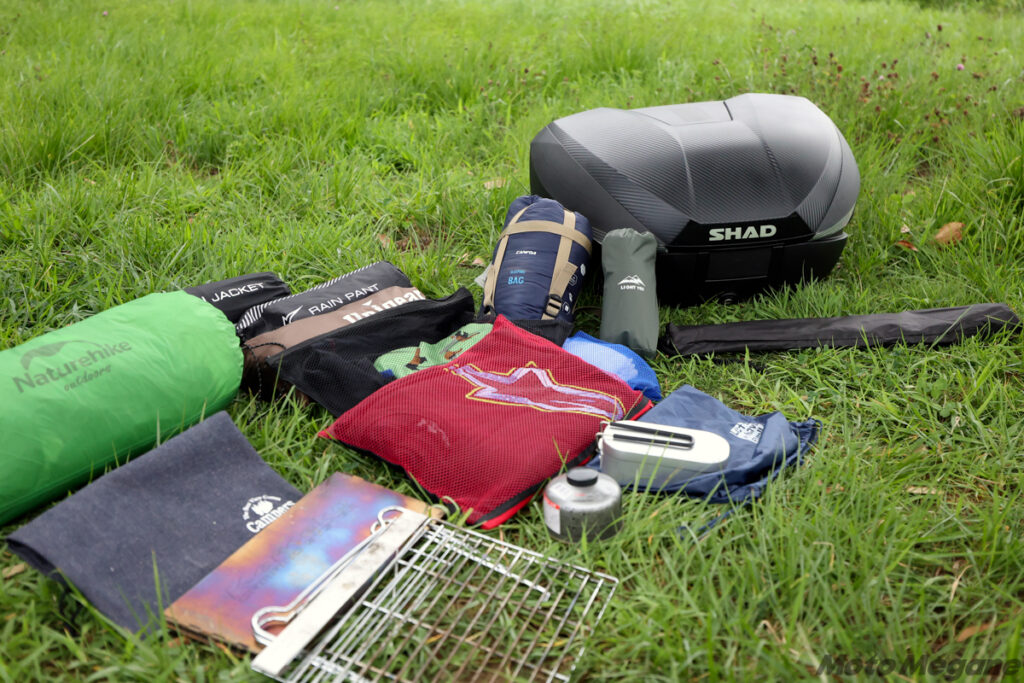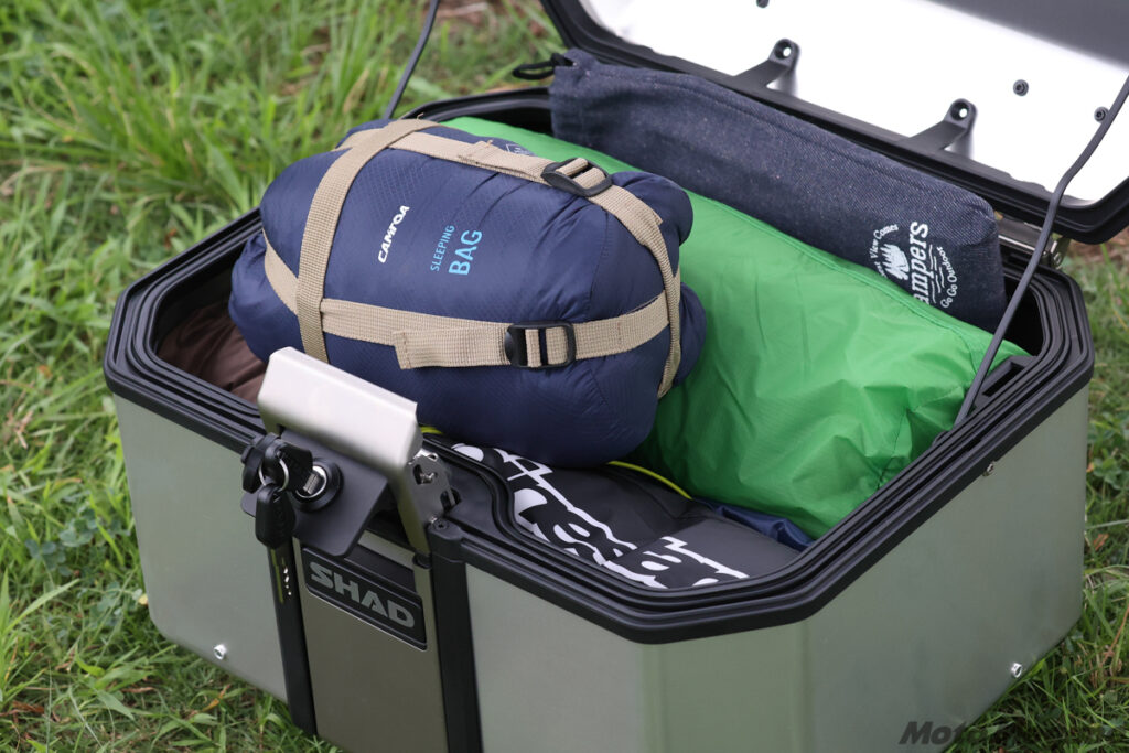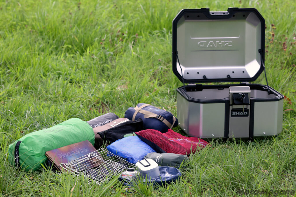 SHADのトップケースには多彩な容量バリエーションがあるが、とくに大容量タイプの場合、人気となっているキャンプツーリングや日帰りでのアウトドア遊びにもすぐに対応できるくらい、愛車の積載性を高めることができる。写真は、1泊のライトなキャンプツーリングを想定して、テントとタープとタープポール、夏用シュラフとマット、焚き火台とメスティンなどのクッカー類、1泊分の着替え、レインウエアなどを収納したもの。長さのあるテントポールを収められるのはSH58Xのみだったが、ミドルサイズのSH39やTERRAのTR48でも、テントポール以外の荷物はすべて収めることができた。ちなみにTR48は、ケース上部にバッグなどを固定できるフックホルダーを搭載しているため、バンドなどを使ってテントポールなどの長尺物を固定することもできる。