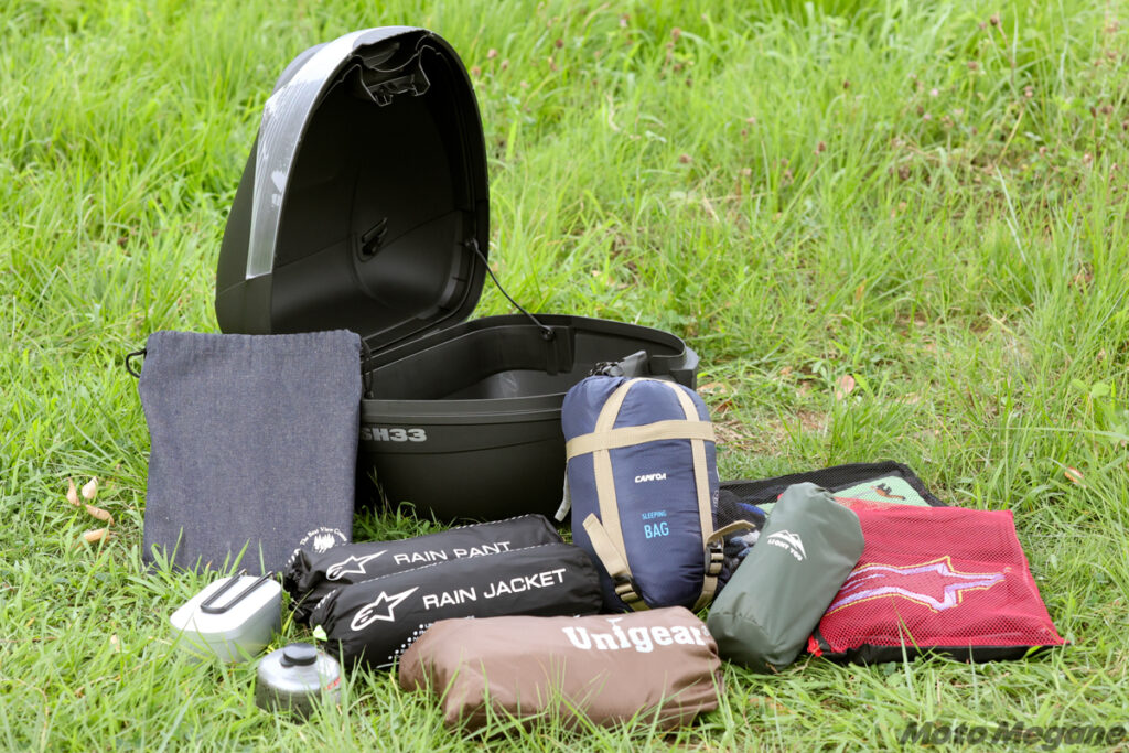 また、かなりコンパクトで車体装着時に大きさが気にならないSH33でも、着替えと焚き火台、クッカー類やタープやシュラフまでは収納可能。もちろん持っていく荷物次第だが、デイキャンプならSH33でも十分に楽しめそうだ。