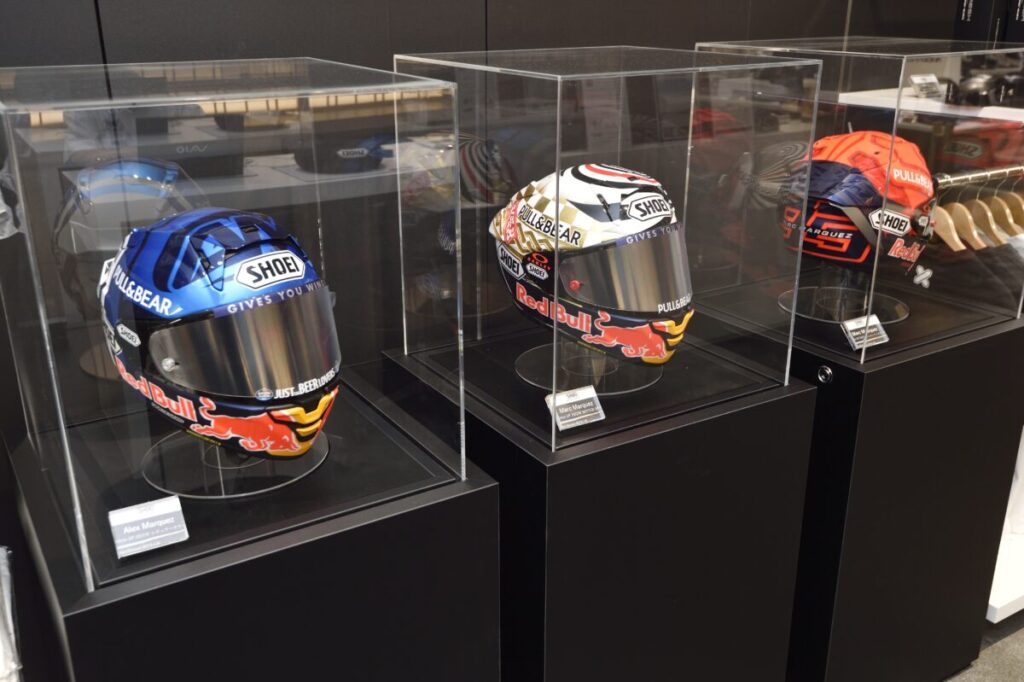 展示されているヘルメットはスポーツモデルからツーリングモデルまでのほぼ全てのモデルが用意されており、モデルごとに分けられて展示されているので非常にわかりやすく、実際に手に取ってじっくりと見ることができる。
