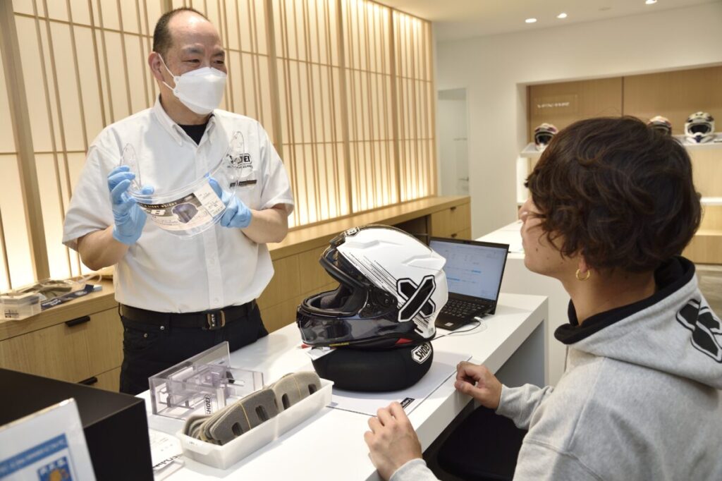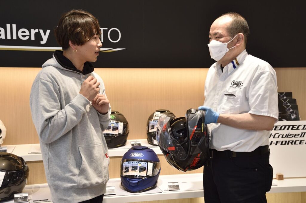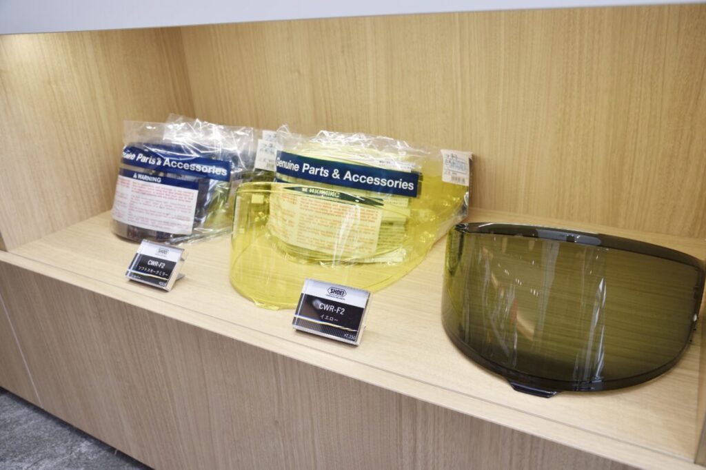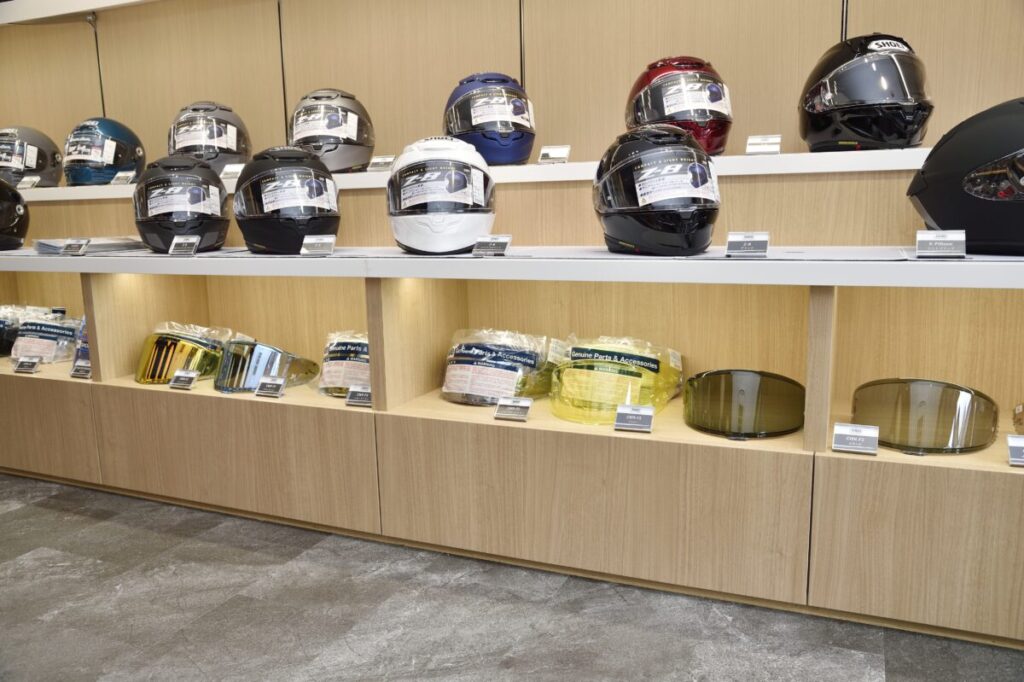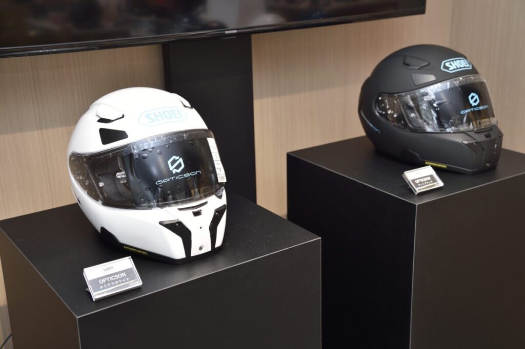 さらに、そんな人気のヘルメットに加えて量販店などではあまり目にすることができない新時代のヘッドアップディスプレイ(HUD)内蔵ヘルメットの「OPTICSON(オプティクソン)」や、交換用シールド各種やアクセサリー類なども数多く用意されているので、その場で合わせてみることができるのもありがたい。