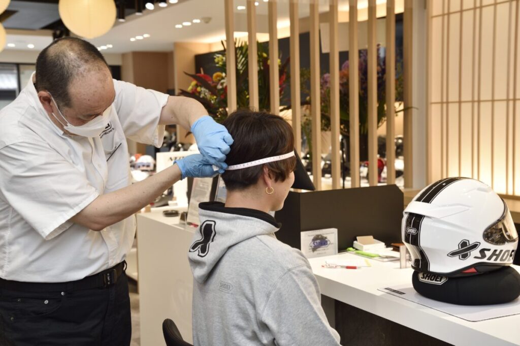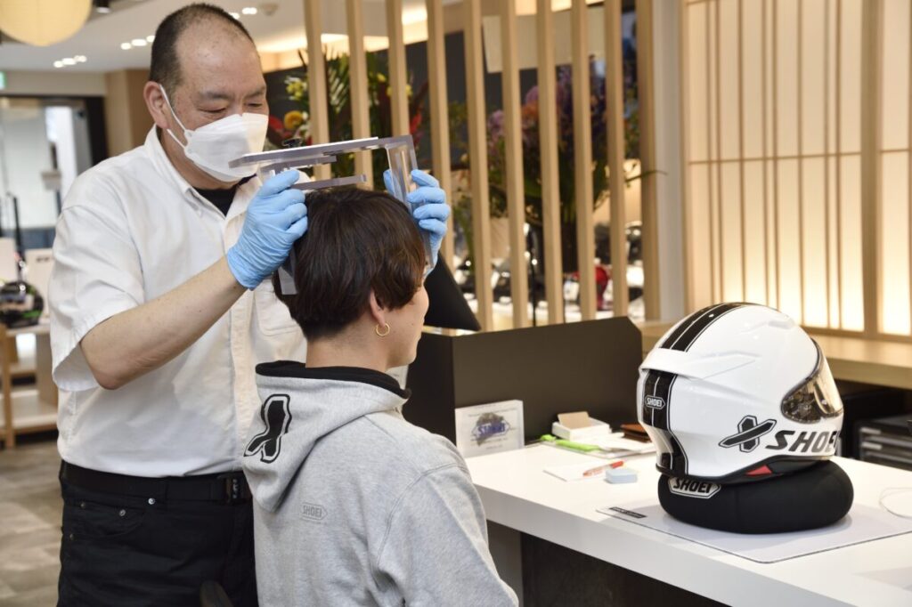 全国に展開するSHOEI Gallery では「SHOEI Personal Fitting System」という内装調整サービスを行っており、頭部の各部を詳細に計測することでデータに基づいた最適なヘルメットサイズを診断することができる。