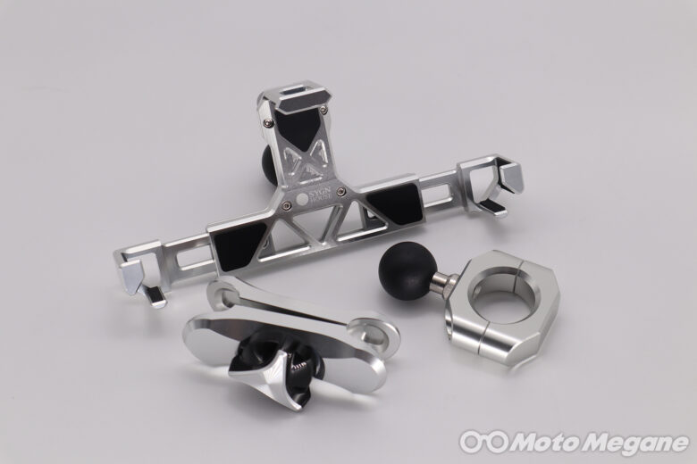 今回リリースされた「A-46スマートフォンホルダー」とそれに組み合わせるアームのBパーツ、そしてハンドルバーに取り付けるベースとなるCパーツだ。