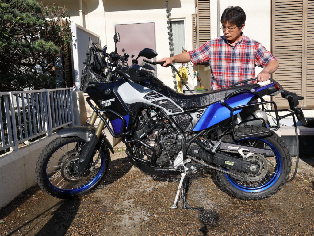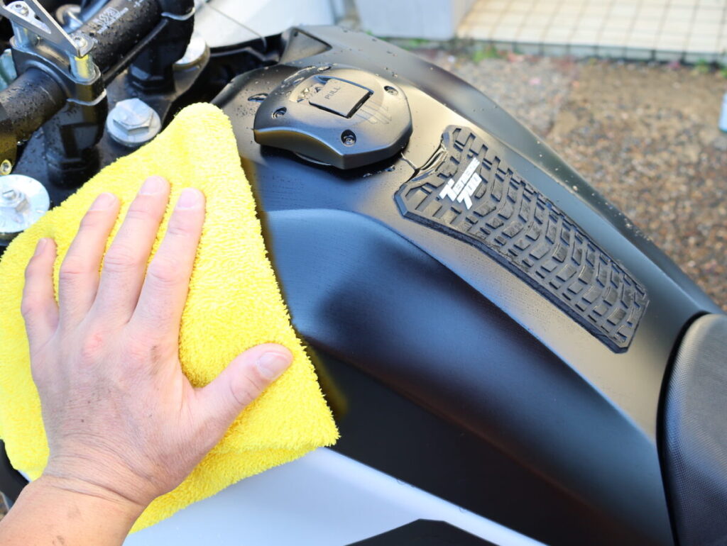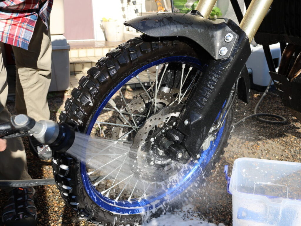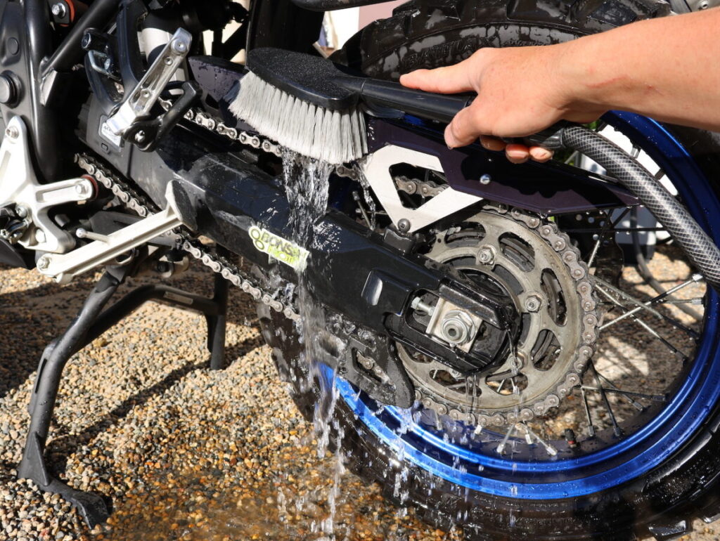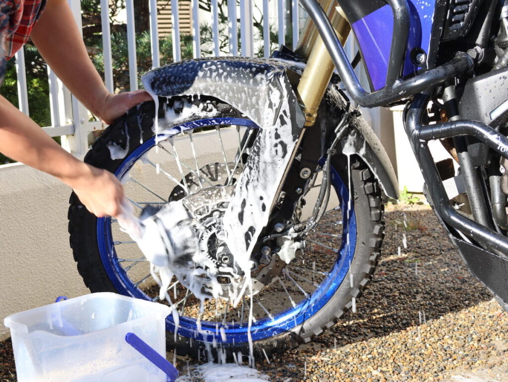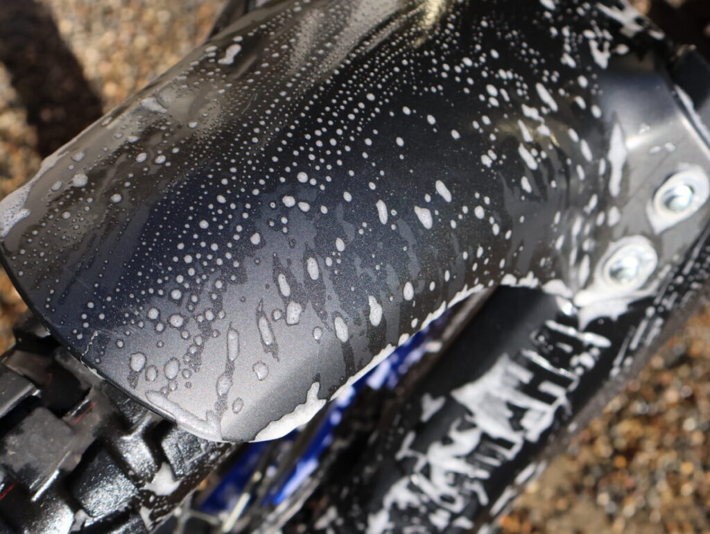 第2段階の全体洗いは、バイクの上側から下へ向かって洗うのがセオリー。ハンドル周り→タンク周辺→シート&テール周り…といったように部位ごとにブラシで擦り、その都度水をかけて洗剤を洗い流す。これはせっかく洗った部分のシャンプーを乾かさないためで、気温や日差しなどの状況に合わせて洗う範囲を調節しよう。
