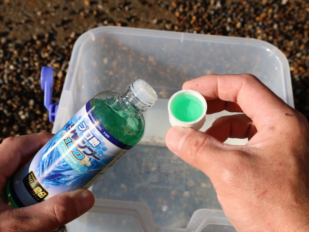 「仕上げ用シャンプー」は、通常洗車ではキャップ1杯に対して1ℓの水で希釈が目安。汚れがひどい場合は、1ℓに対して最大キャップ4杯の割合まで濃度を高めて洗剤の強さを調整する。