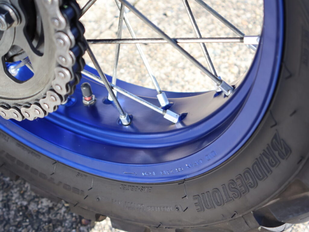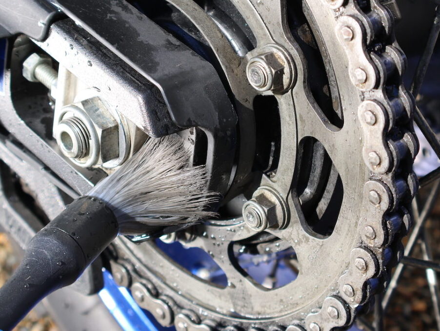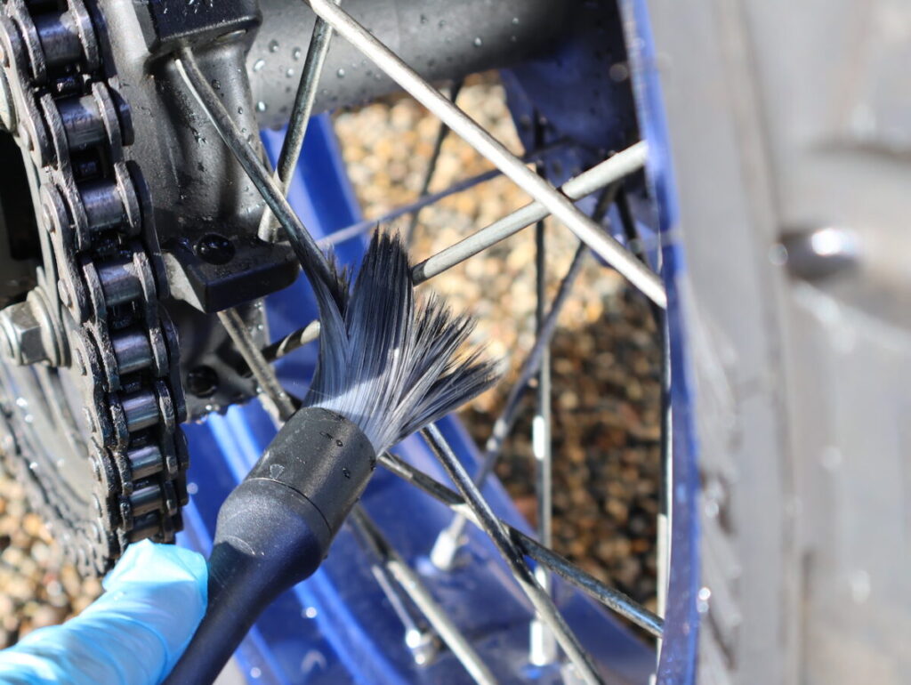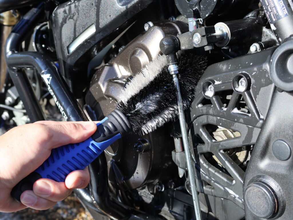 ホイール部分やエンジンの窪みなど、狭い場所を洗うのに便利なのがクロスワイヤーブラシ(990円)だ。特にワイヤースポークの間やホイールハブ部分など、手の届きにくい部分もガシガシ洗えてとても便利だった。