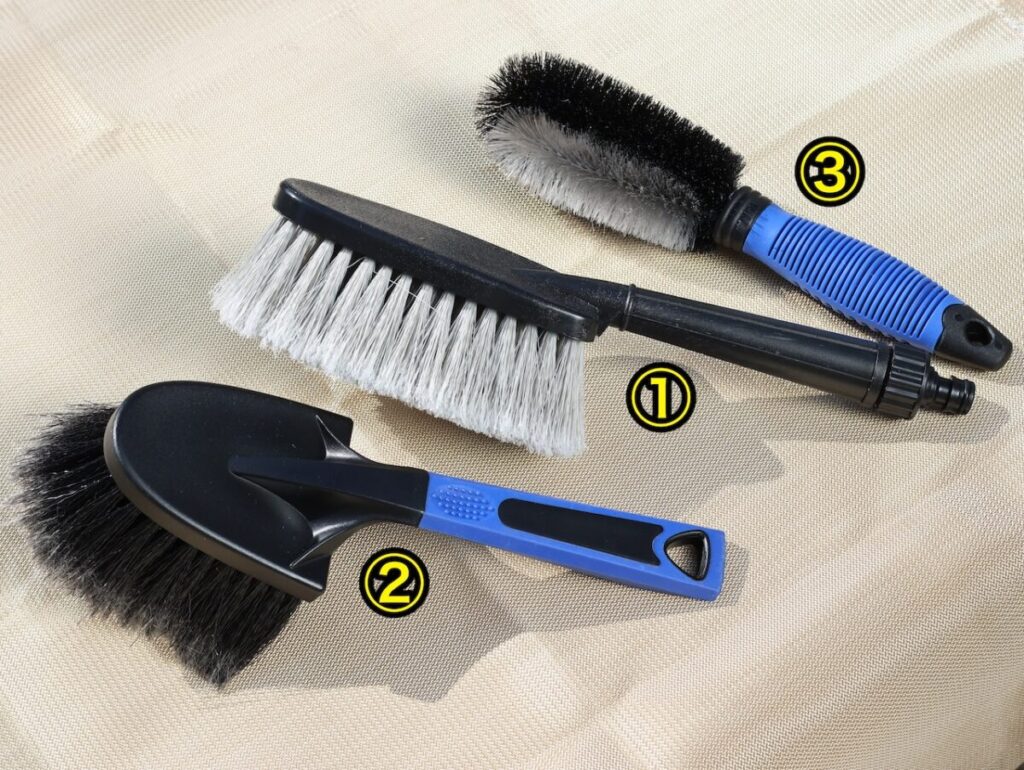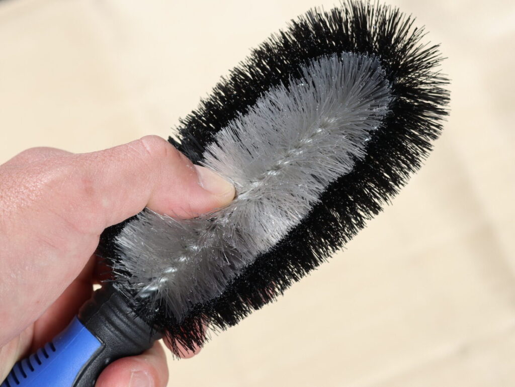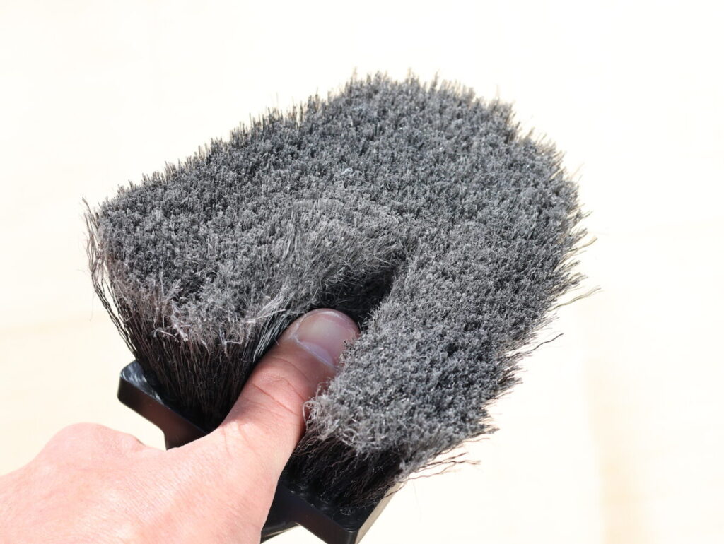 内部に4本のクロスワイヤが仕込まれたタワシ状のブラシ。芯がしっかりしており、毛先にはコシがあるのでホイールやスポークといった頑固な汚れの部分など力を入れて洗いたい部分で使いやすい。しかも、クロスワイヤー部の芯の太さが絶妙でエンジン裏などの狭い場所も洗いやすかった。