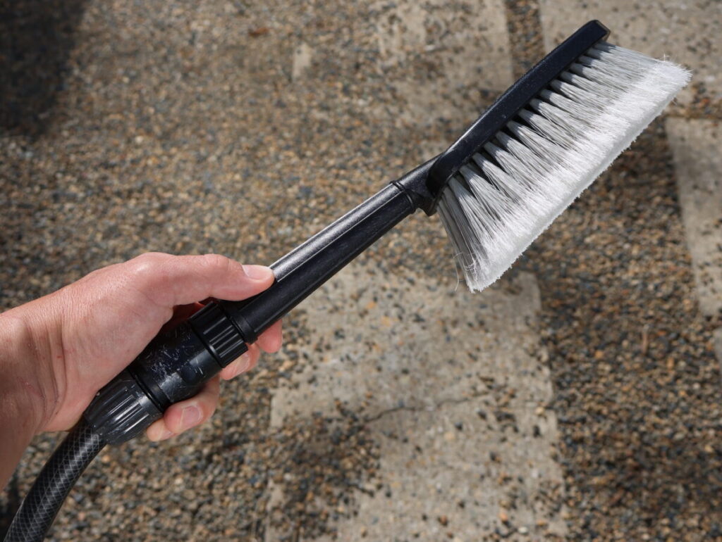 まずはホースに接続して使用する『スプラッシュブラシ』で、水をかけながら砂や泥などのブラシで落ちる大きな汚れを洗い流していく。
