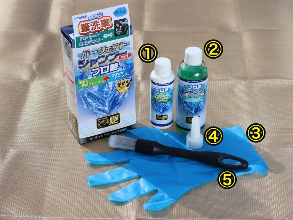 部品構成:マルチクリーナー プロ艶×1、プロ艶シャンプー100×1、専用筆ブラシ×1、保護手袋×1セット、マルチクリーナー用キャップ