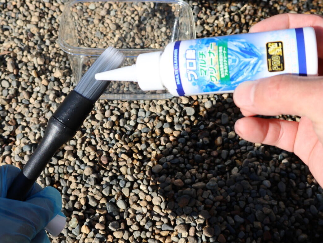 水を吸わせた専用筆ブラシに「マルチクリーナー プロ艶」を原液のまま染み込ませ筆先で汚れを浮かせながらピンポイントで落としていく。ホイールに飛んだチェーン油などはなかなか落ちないものだが、専用クリーナーがあると作業が非常に効率よく行える。