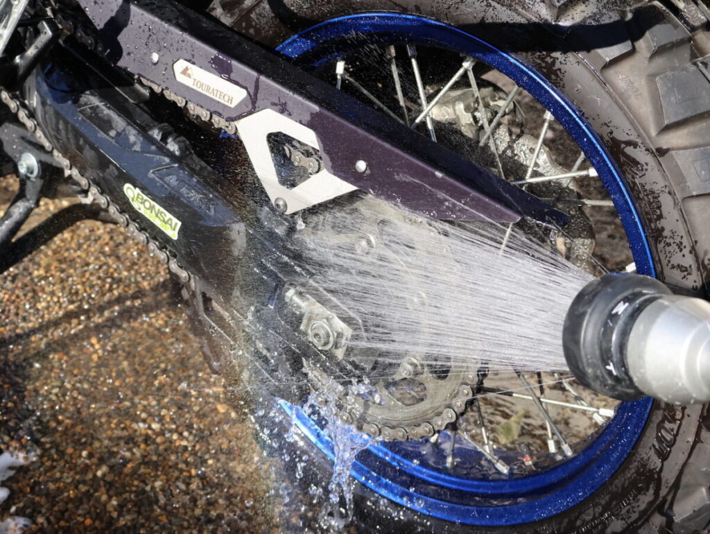 第一段階は、足回りやチェーン、エンジンまわりなど「マルチクリーナー プロ艶」オイルやブレーキダストなどの頑固な汚れを落とすところからスタート。