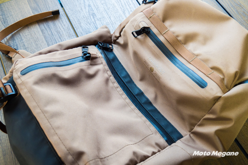 SEALのバックパックエクスパンダブルはゴムと防水ナイロンを組み合わせ、ファスナー類は全て止水ファスナーを採用しています。