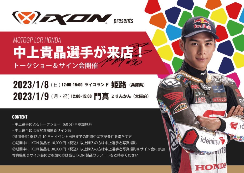 写真撮影&サイン会: IXONブランド製品又は中上貴晶選手応援グッズを期間中に30,000円(税込)以上お買い上げの場合(購入を証明するレシートを当日確認し写真撮影&サイン参加整理券をお渡しします)
