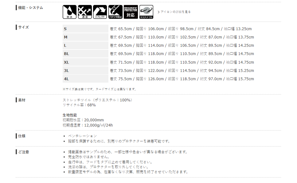- 初期耐水圧20,000mm 透湿12,000g/㎡/24hの透湿防水生地を使用しています。
