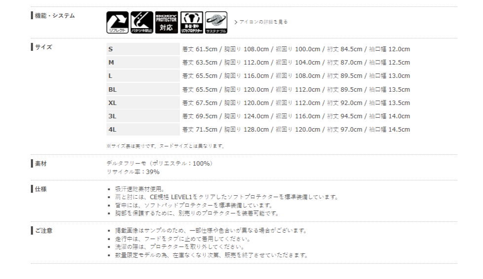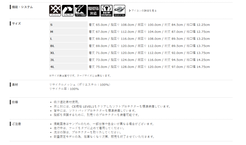 - 肩と肘にはCE規格 LEVEL1のソフトプロテクター、背中にはソフトパッドを標準装備することでプロテクション性と快適性を両立しています。