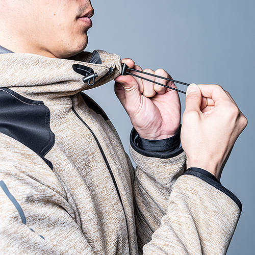 - 走行時のフードへの風の侵入とばたつきを最小限に抑えるドローコードとタブを装備しています。