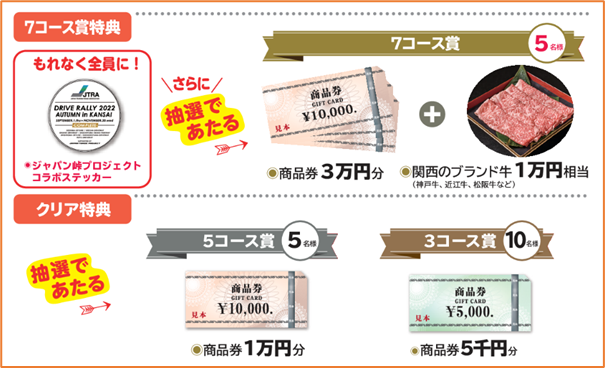 7つのドライブコース(伊勢志摩スカイライン、比叡山ドライブウェイ、奥比叡ドライブウェイ、嵐山-高雄パークウエイ、信貴生駒スカイライン、奈良奥山ドライブウェイ、芦有ドライブウェイ)それぞれに1箇所ずつ設置されているチェックポイント(対象スポット)に行って、お手持ちのスマートフォンやタブレットでQRコードを読み込み、スタンプをゲット! スタンプの獲得数に応じて、抽選で豪華賞品がゲットできるチャンスです!