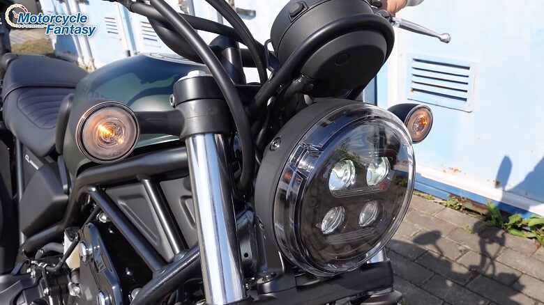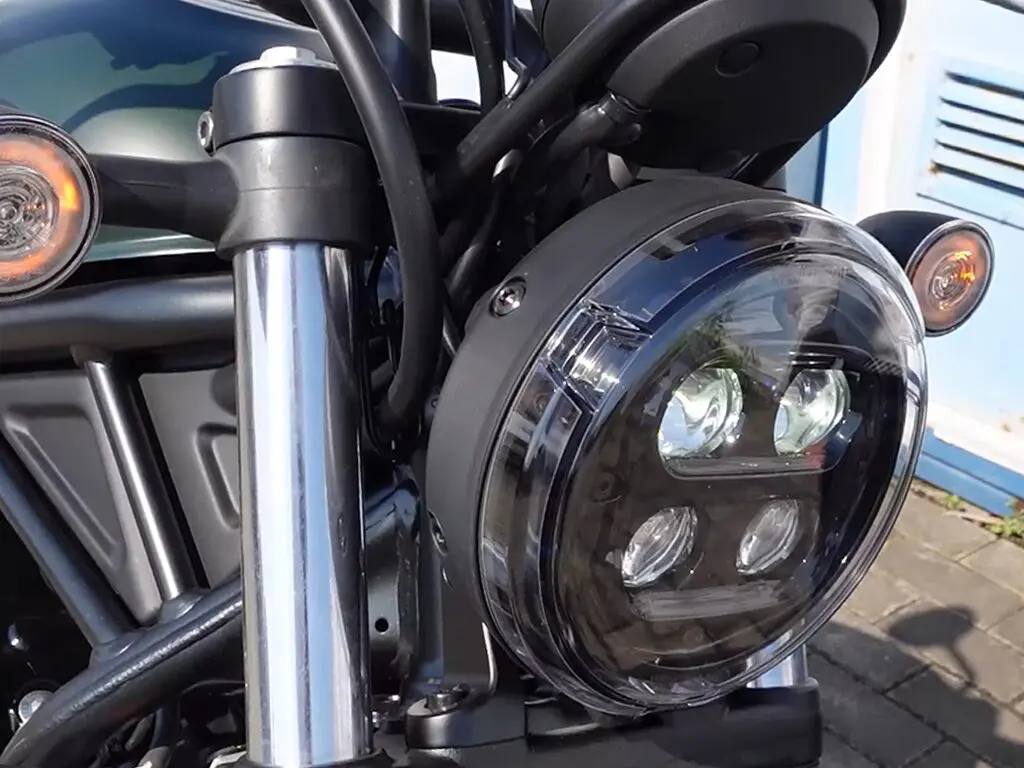 ヘッドライトはクラシックな丸型タイプだが、その内容は4眼式のLEDランプを採用。上側2眼がロービーム、下側2眼がハイビームを担う。ウインカーもLED式で、ポジションランプが点灯するタイプを採用。