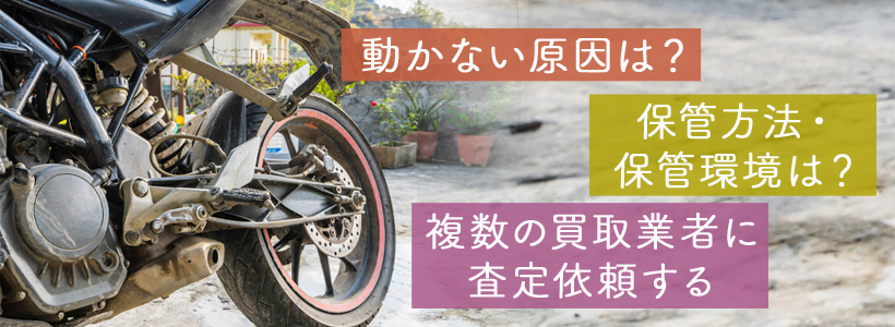 | 不動車 | 長期間放置していたことにより、動かなくなったバイクです。バッテリー交換やオーバーホールなどの簡単な整備で再び動く場合が多く、高額買取が見込めます。 |