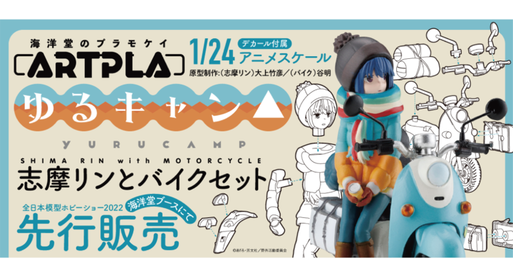 人気キャンプ・アウトドアアニメの「ゆるキャン△」から、志摩リンとバイクがプラモケイになって登場するのに先駆け、2022年10月1日、10月2日の全日本模型ホビーショーにて先行販売、10月3日より予約を行う。2022年11月1日より、EC・直営店にて発売を予定している。