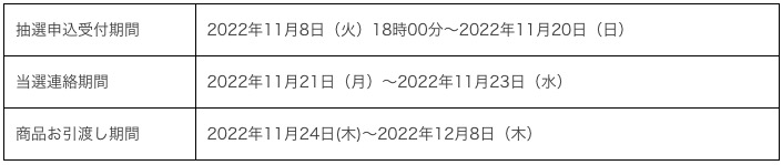 ※商品お渡し期間に、代金のご精算および商品のお渡しができない当選者様は当選権を無効とさせていただきます。